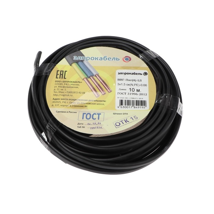 Кабель твердый плоский негорючий малодымный ПромЭл ВВГп-нг(А) LS, 3х1.5, 10 м, ГОСТ