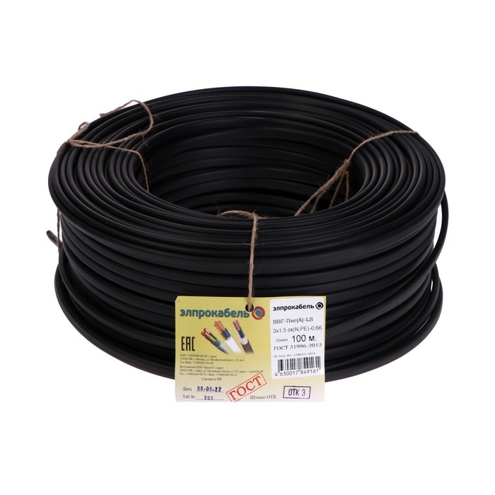 Кабель твердый плоский негорючий малодымный ПромЭл ВВГп-нг(А) LS, 3х1.5, 100 м, ГОСТ