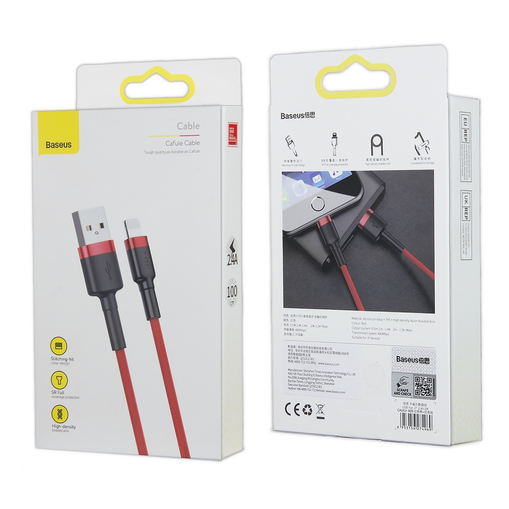 Кабель USB Lightning 1M 2.4A Cafule Cable Baseus красный с черным CALKLF-B09