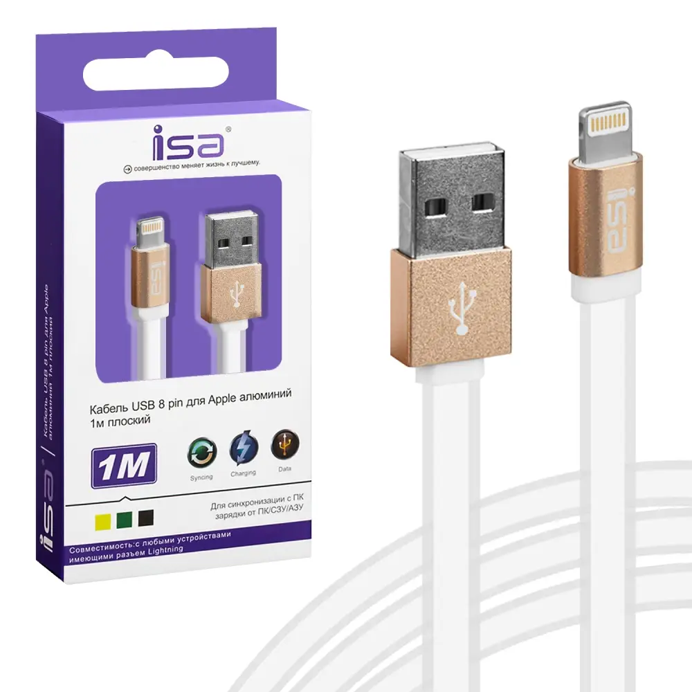 Кабель USB на Lightning 1m алюминий плоский ISA белый