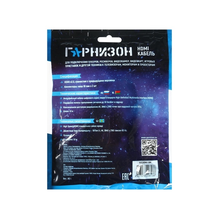 Интерфейсный кабель соединяет два устройства с выходами HDMI. Используйте его для подключения монитора к системному блоку, проектора — к ноутбуку или Blu-Ray плеера — к телевизору. Изделие со спецификацией интерфейса версии 1.4 поддерживает передачу картинки с разрешением 4K, а также 3D-видео. Выводите изображение высокой чёткости с помощью кабеля HDMI.