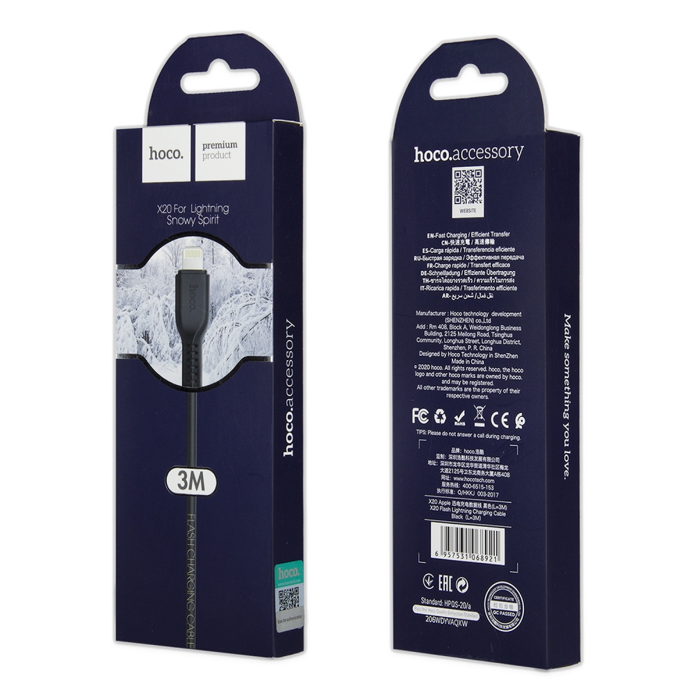 Кабель X20 USB на Lightning 3M 2.4А HOCO черный
