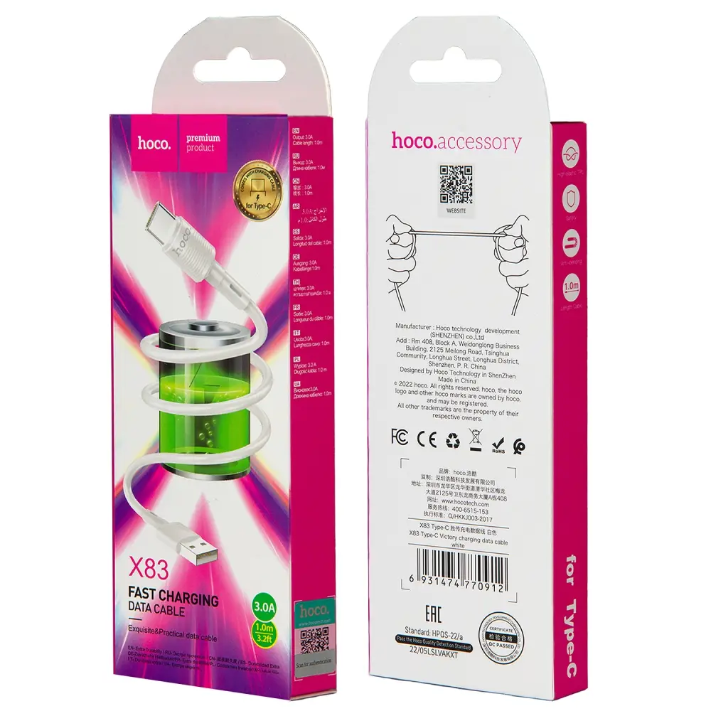Кабель X83 USB Type-C 1M 3A HOCO белый