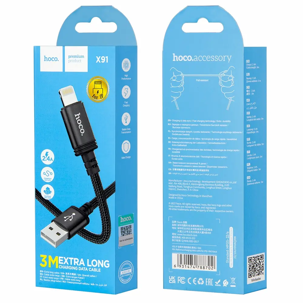 Кабель X91 USB на Lightning 3M 2.4A HOCO черный