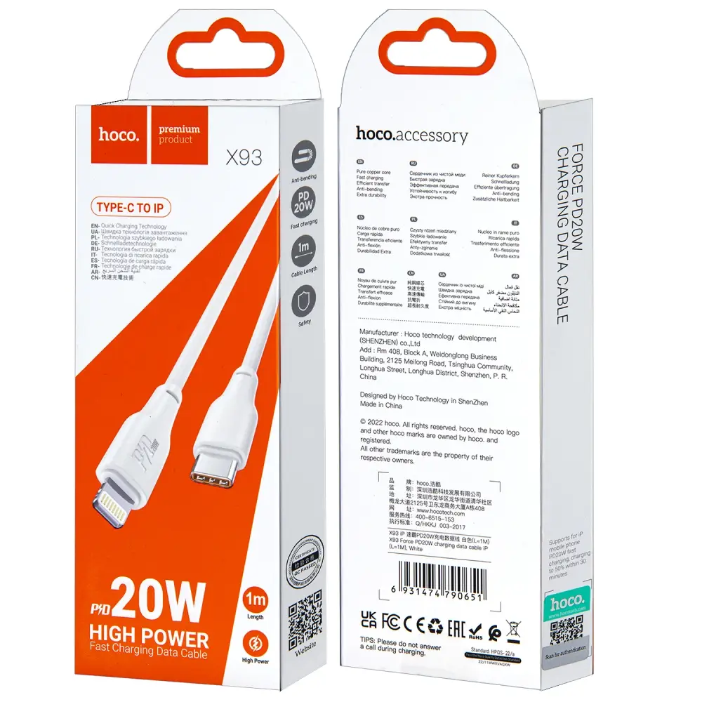 Кабель X93 Type-C на Lightning 1M 20W HOCO белый