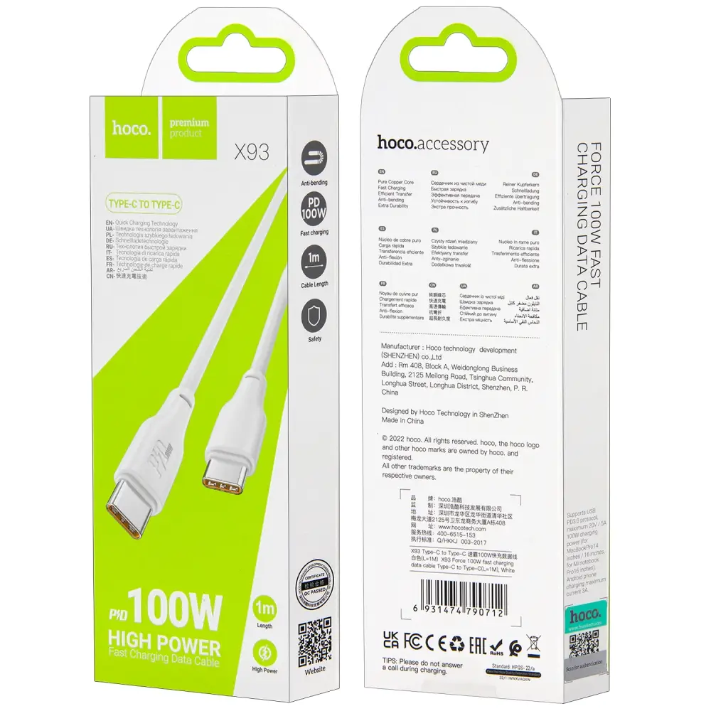 Кабель X93 Type-C на Type-C 1m 3A 100W HOCO белый