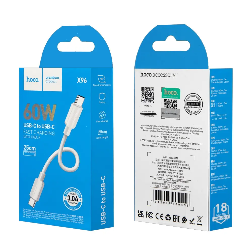 Кабель X96 Type-C на Type-C 0.25m 3A 60W HOCO белый