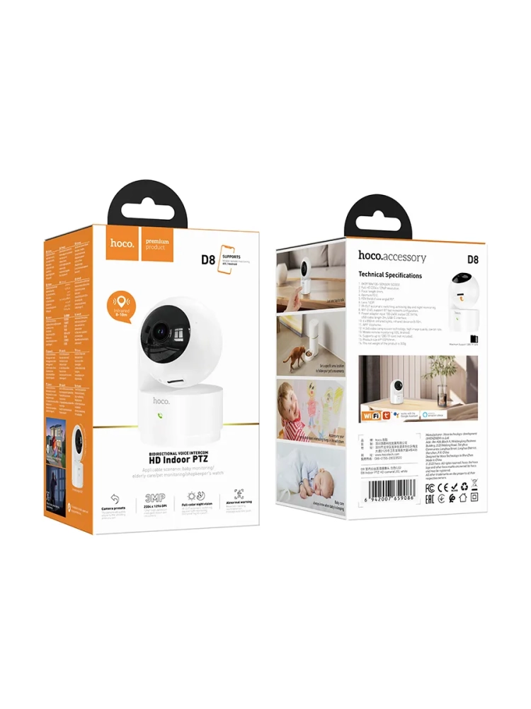 Hoco D8 - это внутренняя камера видеонаблюдения с высоким разрешением 3 МП Full HD (2304×1296), обеспечивающая чёткое изображение в любое время суток. Благодаря автоматическому переключению IR-CUT, камера идеально подходит для дневного и ночного мониторинга (поддерживает Android и iOS).