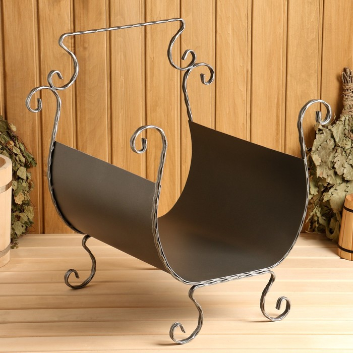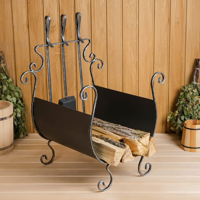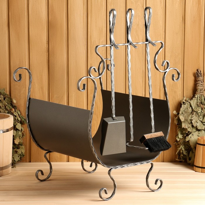Каминный набор КН-6-21 кованый с дровницей, цвет серебро, 3 предмета: кочерга, совок, метёлка 3000