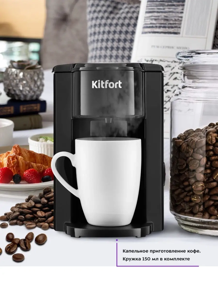 Кофеварка капельная электрическая Kitfort КТ-763 – это идеальное кухонное решение для любителей ароматного кофе. Эта кофеварка, обладая мощностью 350 Вт и объемом резервуара 0.125 л, позволяет быстро приготовить свежий напиток. Электрический механизм нагревает воду до температуры 80-90 °С, после чего она медленно проходит через фильтр с молотым кофе и попадает в кружку. Идеальный подарок на любой случай: на Новый год, 23 февраля, 8 марта, день рождения, свадьбу или юбилей! Благодаря функции автоотключения, кофеварка автоматически выключается через 7 минут после начала работы. Эта модель от Китфорт отличается компактностью и легкостью, что делает её отличным выбором для небольших кухонь или офисов. Она занимает минимум места на вашей кухне или в доме, но при этом обеспечивает качественное приготовление кофе. В комплекте идет кружка, идеально подходящая по размеру к резервуару кофеварки. Кофеварка предназначена для использования как дома, так и в офисе – она станет незаменимым помощником в создании уютной атмосферы на вашей кухне или рабочем месте. Простота управления обеспечивается одной кнопкой включения/выключения. Kitfort КТ-763 – это не просто бытовой прибор; это ваш личный мини бариста у вас дома! Наслаждайтесь вкусом свежеприготовленного молотого кофе каждый день без лишних хлопот благодаря этой надежной электрической кофеварке.