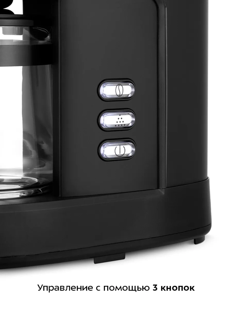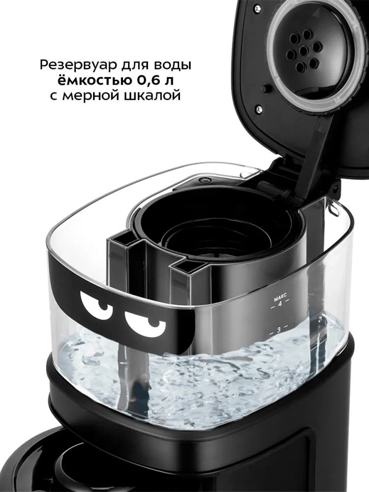 Резервуар для воды емкостью 0,6 л позволяет за один раз приготовить кофе на 4 чашки (примерно по 125–150 мл). На резервуаре для воды и кофейнике нанесены соответствующие отметки, поэтому вам будет удобно приготовить нужное количество чашек кофе. Кофейник стеклянный, поэтому вы всегда можете видеть, сколько кофе осталось. Резервуар для воды красиво подсвечивается при включении кофемашины.