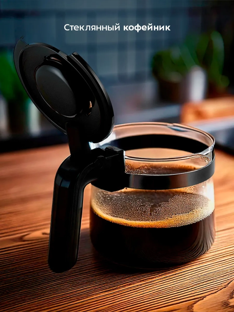 Воронка кофемашины оборудована противокапельной системой — затвором, приостанавливающим подачу кофе при вынимании кофейника из кофемашины. Вы можете налить кофе в чашку, не дожидаясь окончания приготовления.