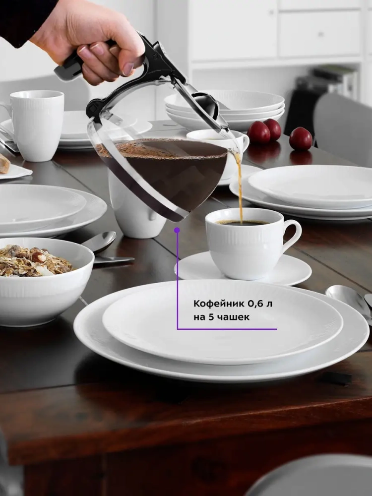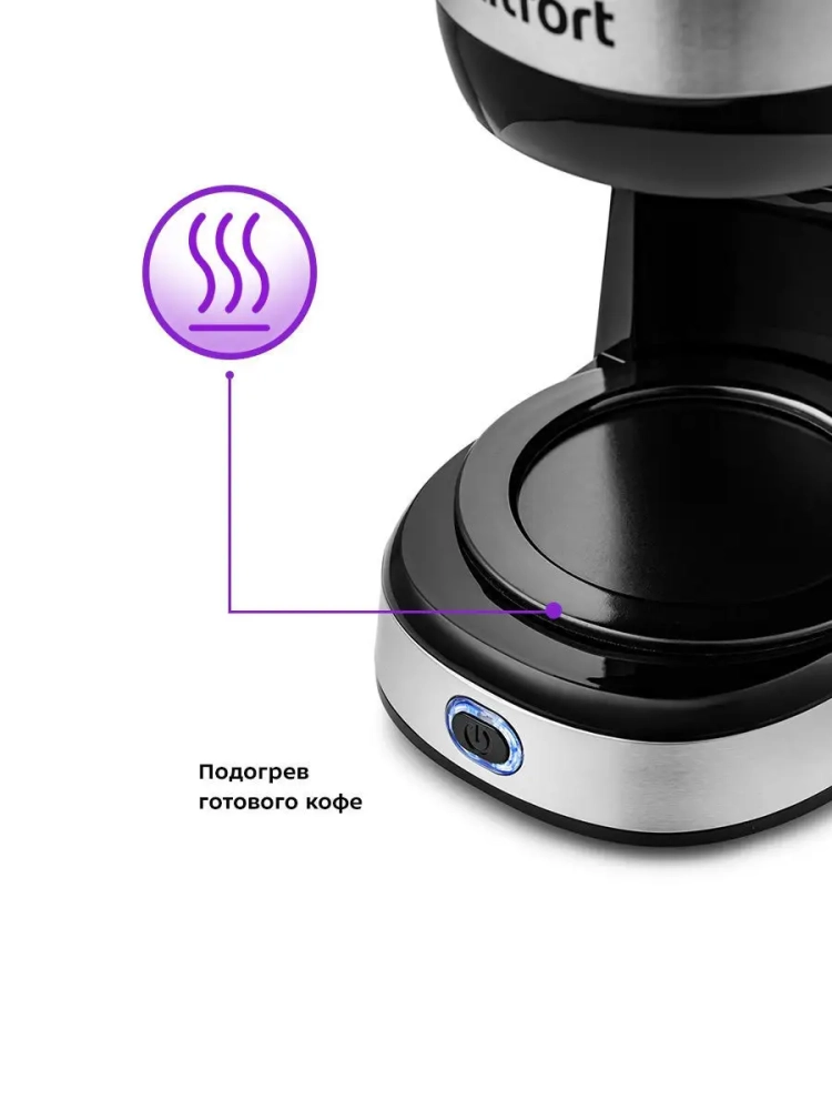 Капельная кофеварка Китфорт КТ-730 — это идеальное бытовое решение для любителей ароматного кофе. Эта кофеварка, работающая от сети с мощностью 750 Вт, позволяет быстро и удобно приготовить любимый напиток в домашних условиях или офисе. Идеальный подарок на любой случай: на Новый год, 23 февраля, 8 марта, день рождения, свадьбу или юбилей! Управление осуществляется всего одной кнопкой, что делает процесс приготовления простым и интуитивно понятным. Вода в капельной кофеварке нагревается до температуры 80–90 °С и медленно проходит через фильтр с молотым кофе. Это обеспечивает насыщенный вкус и аромат вашего напитка. После завершения процесса приготовления устройство автоматически переходит в режим подогрева, поддерживая температуру готового кофе на платформе с подогревом в течение 40 минут. Электрокофеварка имеет прозрачный корпус объемом 600 мл, что позволяет контролировать количество оставшегося напитка. Противокапельная система предотвращает проливание при вынимании кофейника из устройства — вы можете налить себе чашку свежего кофе даже во время его приготовления. Эта автоматическая модель от Kitfort оснащена функцией автоотключения для безопасности использования: через определенное время после завершения работы она автоматически выключается, экономя электроэнергию и обеспечивая безопасность вашего дома. Кофейный аппарат Китфорт КТ-730 идеально подходит для использования как дома, так и на работе благодаря своей компактности и функциональности. Она способна приготовить до пяти чашек по 120 мл за один раз — отличный выбор для небольшой компании или семьи.