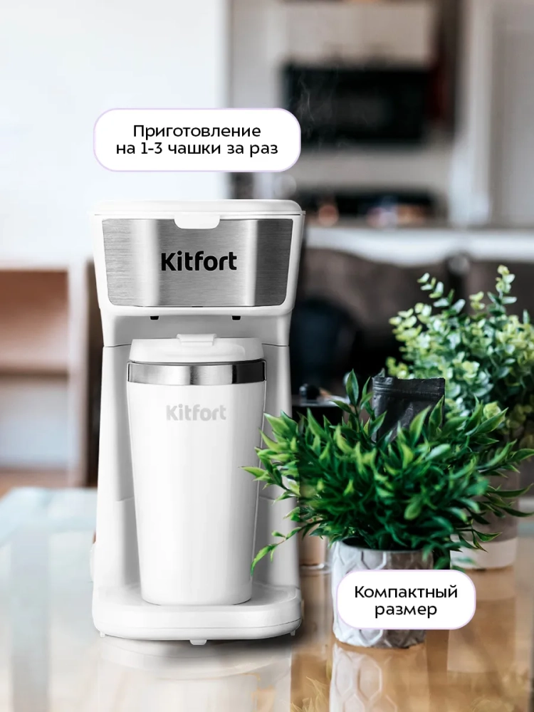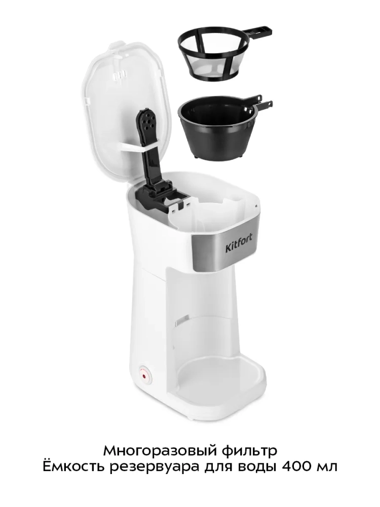 Капельная кофеварка Kitfort КТ-7411 готовит ароматный черный кофе из молотого кофе одним нажатием кнопки. В кофеварке горячая вода медленно поступает в фильтр с молотым кофе. Пройдя через него, вода попадает в термокружку, которая сохранит тепло вашего кофе. Термокружка выполнена из нержавеющей стали и пластика, что позволяет сохранить напиток теплым. Отверстие для питья имеет удобную форму и закрывается крышкой, поэтому вы сможете взять кофе с собой и пить на ходу. Многоразовым фильтром можно пользоваться неограниченное количество раз. Сетка фильтра изготовлена из нейлона. Фильтр вмещает 15 грамм молотого кофе, а резервуар для воды имеет емкость 400 мл. Кофеварка легкая и занимает мало места, что очень удобно в квартирах с маленькими кухнями. Устройство предназначено для приготовления кофе в домашних условиях или в офисе.