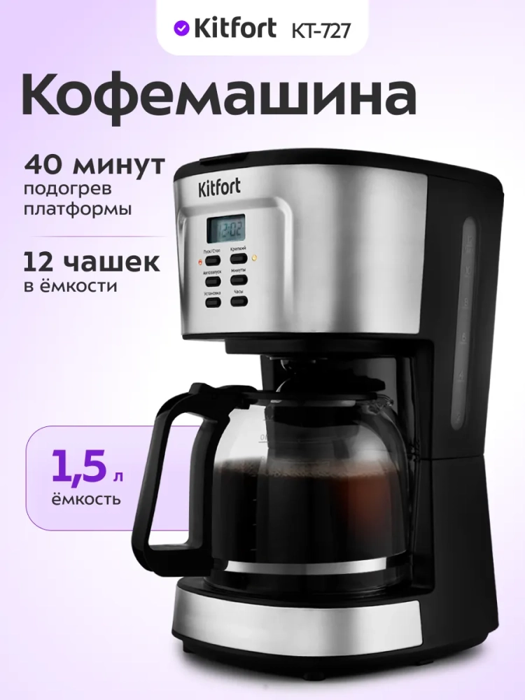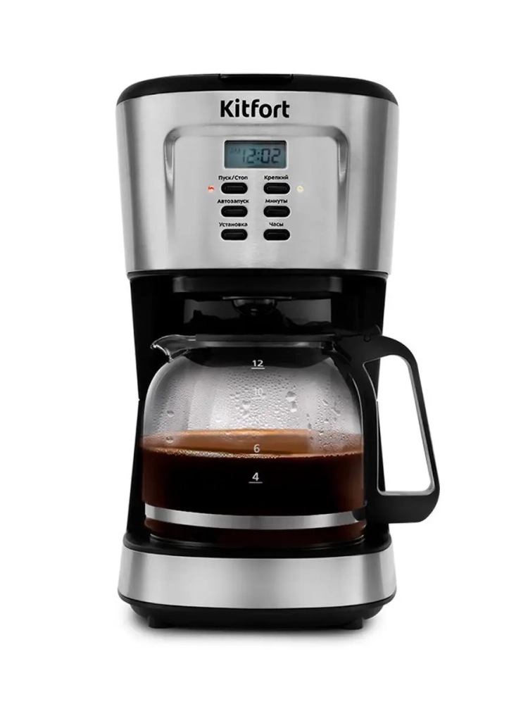 Капельная кофеварка электрическая с подогревом КТ-727 от Kitfort — это превосходный выбор для ценителей ароматного кофе. Эта электрокофеварка, работающая по капельному принципу, позволяет приготовить вкусный напиток из молотого кофе. Вода в кофеварке нагревается до температуры 80-90 °С и медленно проходит через фильтр с молотым кофе, после чего попадает в кофейник. По завершении процесса приготовления устройство автоматически переходит в режим подогрева с автоотключением, поддерживая температуру готового напитка в стеклянной колбе на платформе с подогревом в течение 40 минут. Это удобно для тех, кто предпочитает наслаждаться горячим кофе без спешки. Идеальный подарок на любой случай: на Новый год, 23 февраля, 8 марта, день рождения, свадьбу или юбилей! Капельная система оснащена противокапельным затвором: вы можете налить себе чашку свежего кофе даже во время его приготовления без риска проливания. Резервуар объемом 1 л. 600 мл. позволяет за один раз приготовить до 12 чашек по 130 мл каждая — отличный выбор как для дома, так и для офиса. Прозрачный корпус кофейника дает возможность контролировать уровень оставшегося кофейного напитка. На задней части корпуса предусмотрен удобный отсек для хранения шнура питания. Эта модель от Китфорт отличается не только функциональностью и простотой использования, но и стильным дизайном. Аппарат станет отличным дополнением к любой кухне или офису благодаря своему современному внешнему виду. Кофеварка Kitfort КТ-727 предназначена исключительно для использования с молотым кофе и обеспечивает качественное приготовление вашего любимого напитка каждый день.