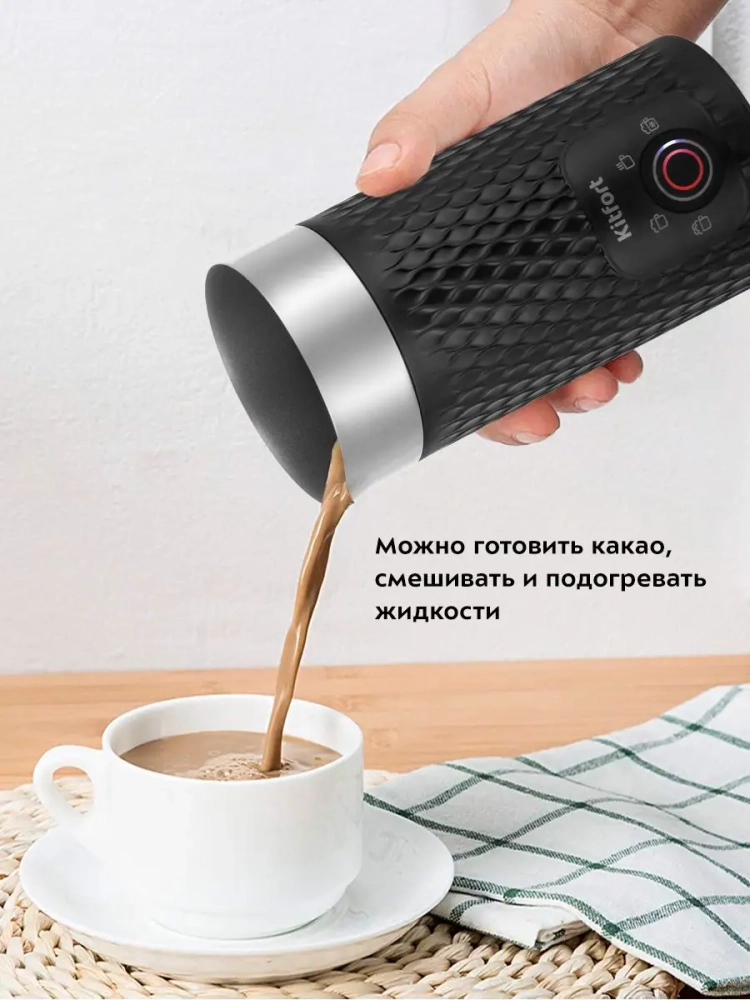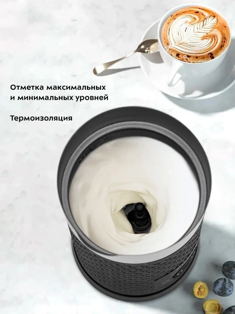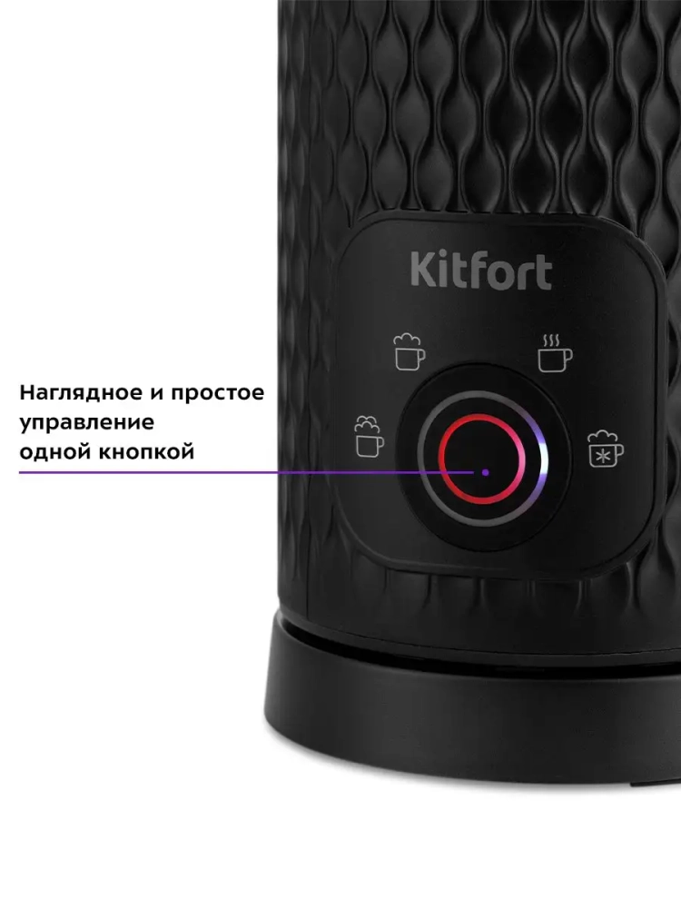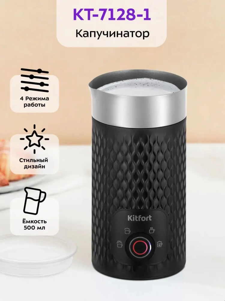 Капучинатор Kitfort КТ-7128 — это устройство для приготовления молочной пенки, используемой для напитков на базе эспрессо: капучино, латте и латте макиато. Прибор работает в четырех режимах: плотная или воздушная пенка с нагревом, смешивание с нагревом и вспенивание без нагрева. Управление осуществляется с помощью кнопки «Вкл/Выкл». Капучинатор автоматически отключается, когда процесс вспенивания или смешивания выполнен. Также вы можете остановить процесс приготовления вручную. Подставка с центральным контактом дает возможность располагать на ней корпус в любом положении, обеспечивая вращение на 360°. А через прозрачную крышку можно наблюдать за приготовлением. Стенки капучинатора не будут горячими после окончания работы из-за особенности конструкции устройства, поэтому вы не обожжетесь, когда будете брать капучинатор в руку. Капучинатор — идеальный выбор для тех, кому не хочется осваивать процесс самостоятельного вспенивания молока, следить за температурой. Достаточно наполнить капучинатор нужным количеством молока и нажать кнопку. Через две-три минуты холодная или горячая молочная пена готова. Кроме того, в капучинаторе можно готовить какао, а также смешивать и подогревать жидкости.