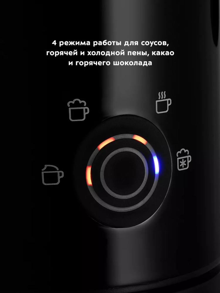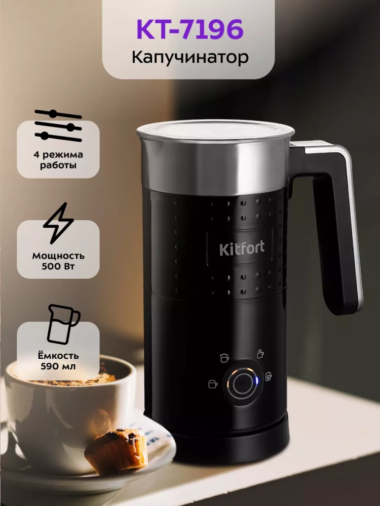 Капучинатор Kitfort КТ-7196 — это устройство для приготовления молочной пенки, используемой для напитков на базе эспрессо: капучино, латте и латте макиато. Прибор работает в четырех режимах: плотная и воздушная молочная пенка с нагревом, смешивание с нагревом и вспенивание без нагрева.