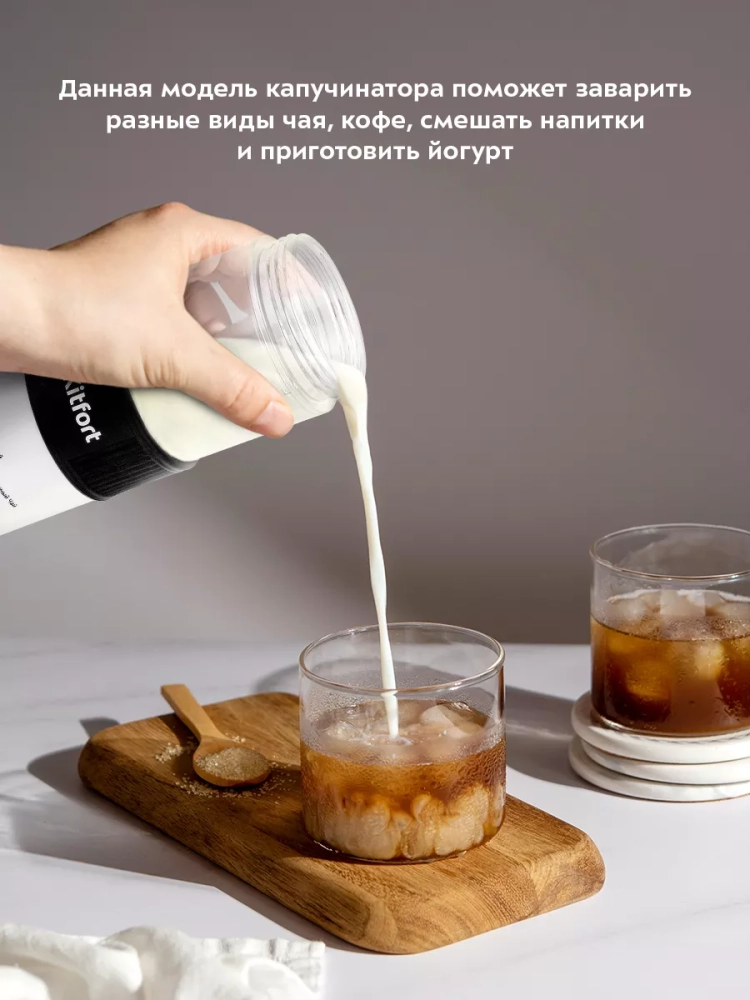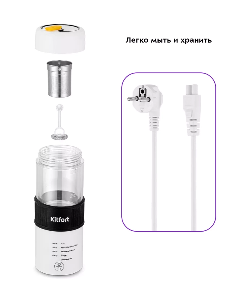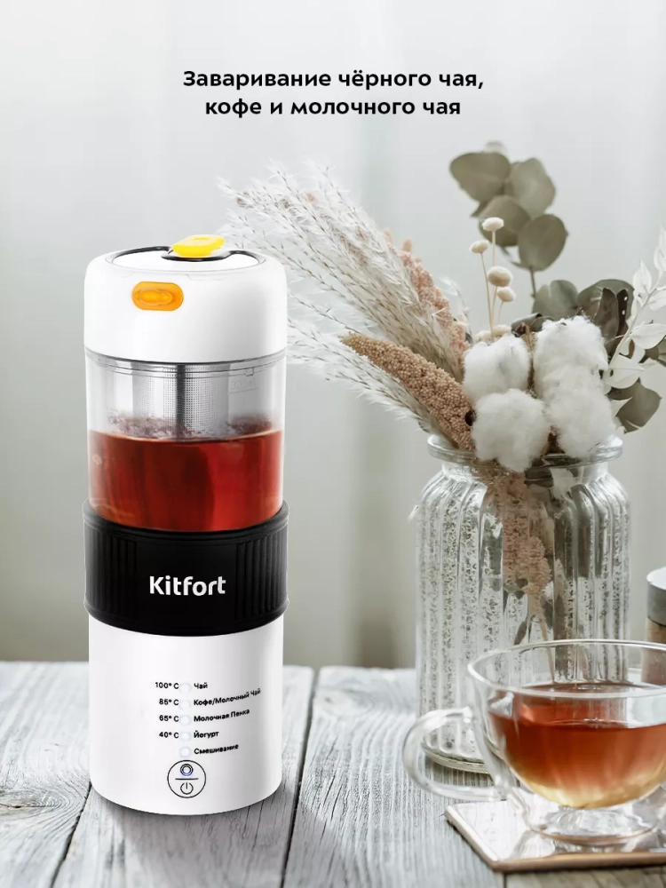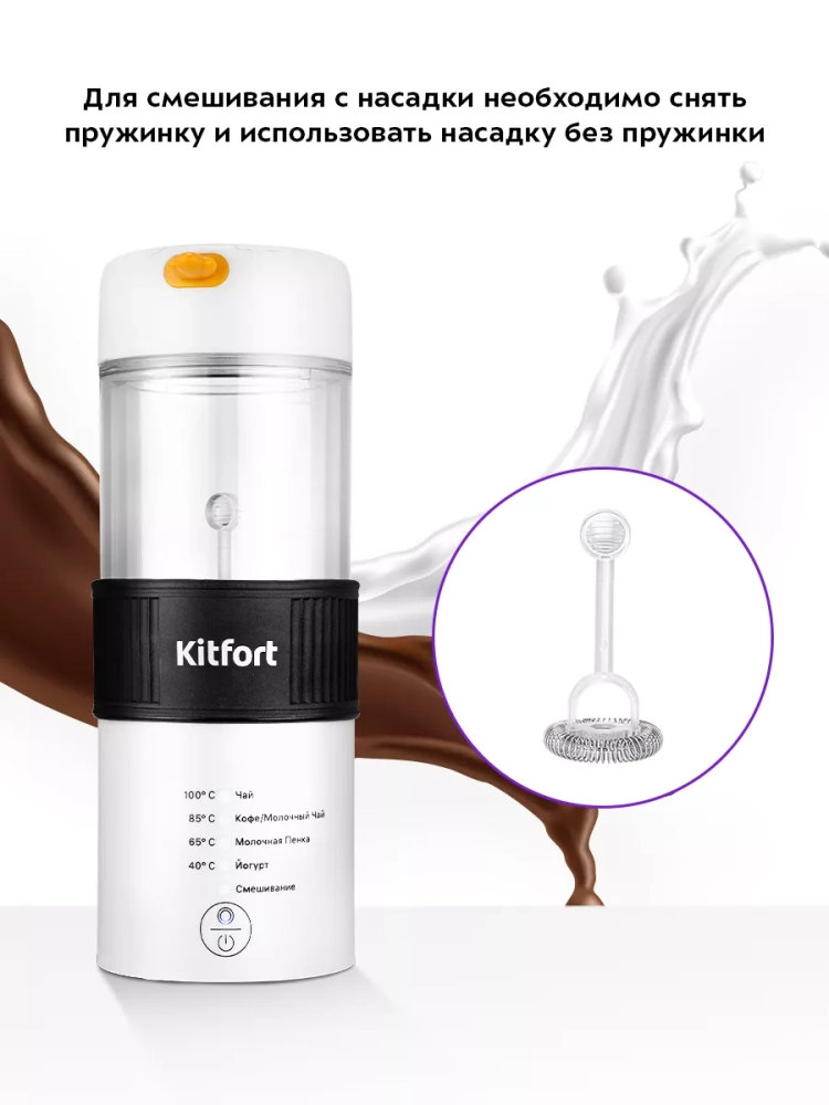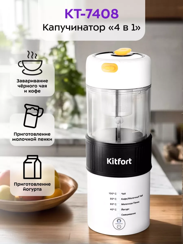 Капучинатор Kitfort КТ-7408 (4 в 1) — это устройство для приготовления молочной пенки, используемой для напитков на базе эспрессо: капучино, латте и латте макиато. Данная модель капучинатора многофункциональна и поможет также заварить разные виды чая, кофе, смешать напитки и приготовить йогурт.