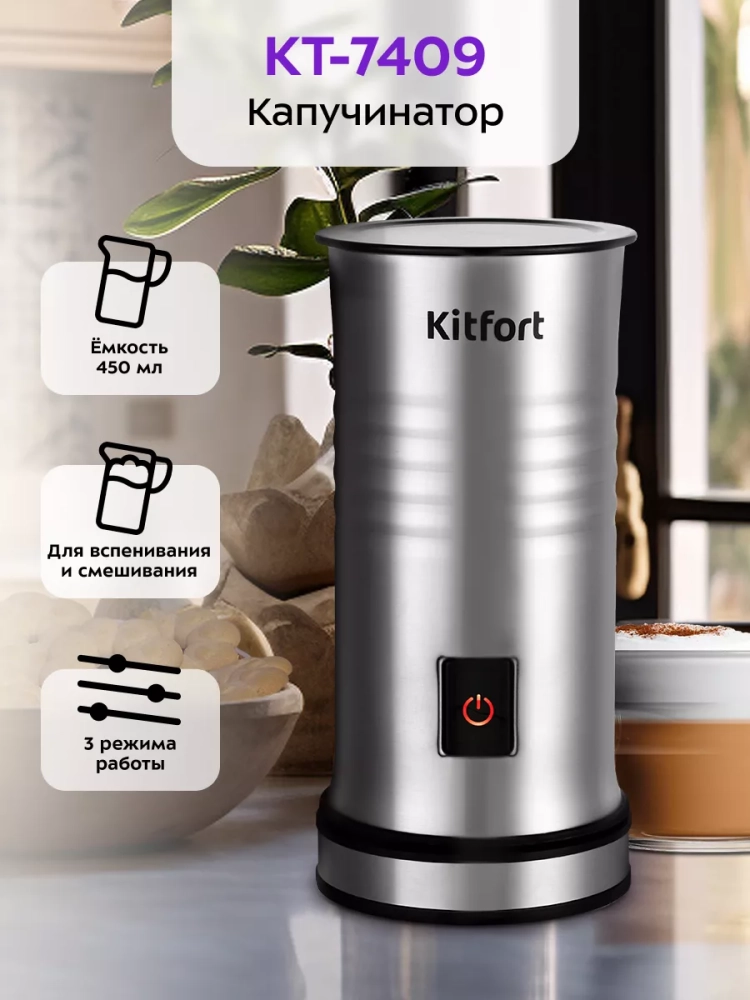 Капучинатор Kitfort КТ-7409 — это устройство для приготовления молочной пенки, используемой для напитков на базе эспрессо: капучино, латте и латте макиато. Прибор работает в трех режимах: вспенивание с подогревом, смешивание с подогревом и вспенивание без подогрева.