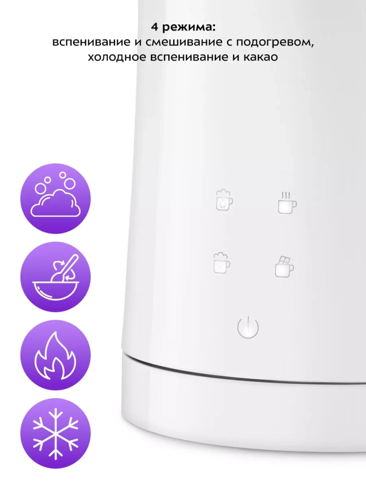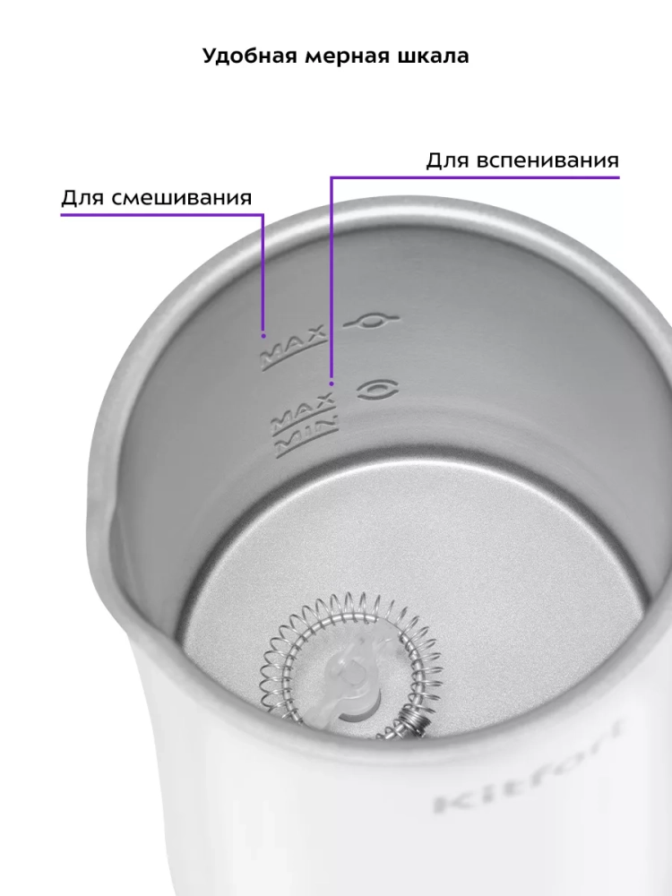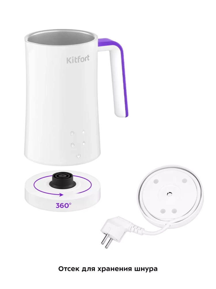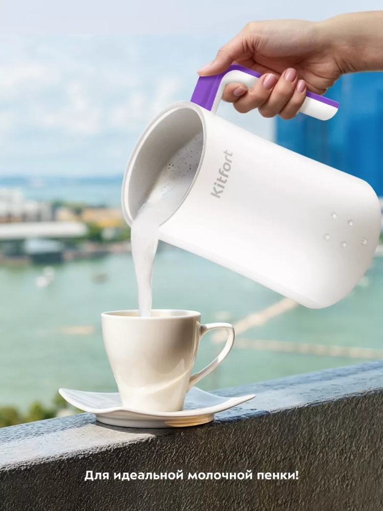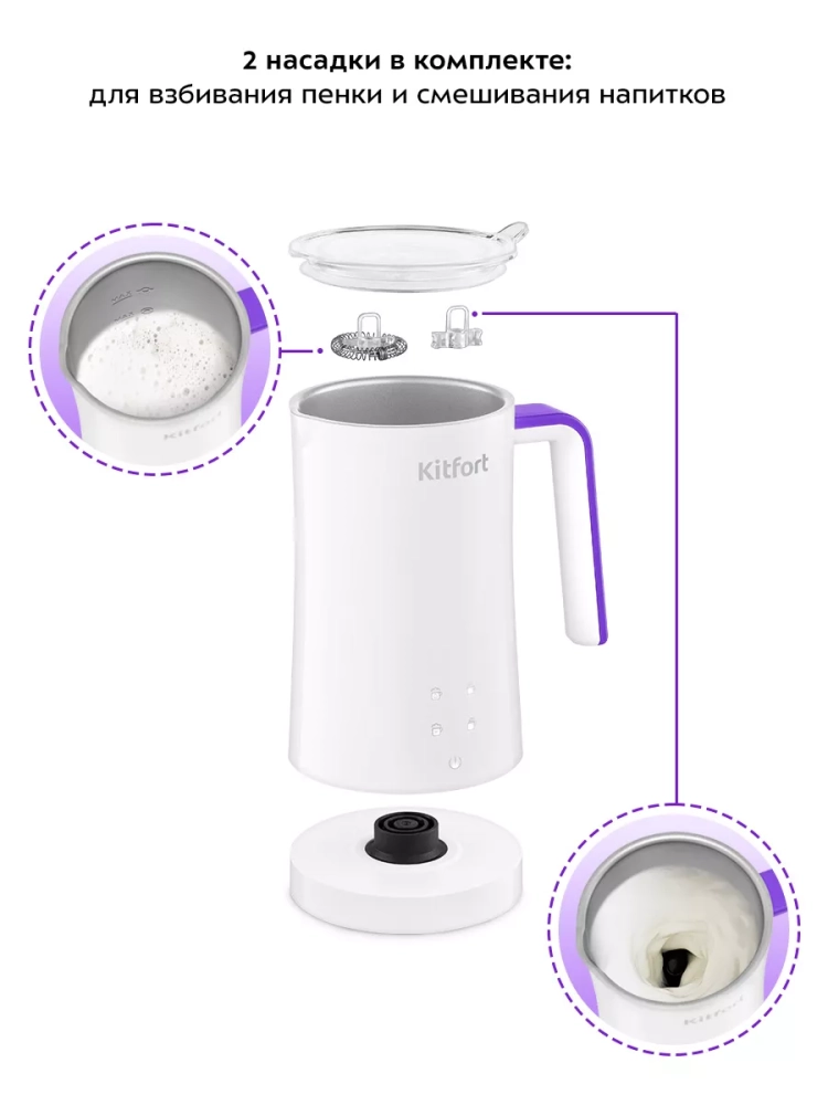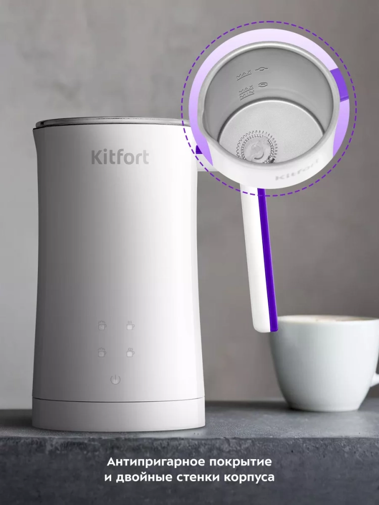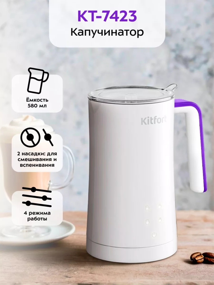 Капучинатор Kitfort КТ-7423 — это устройство для приготовления молочной пенки, используемой для напитков на базе эспрессо (капучино, латте и латте макиато), а также для приготовления какао. В капучинаторе также можно смешать и подогреть молоко или другие напитки. Прибор работает в четырех режимах: вспенивание с подогревом, смешивание с подогревом, холодное вспенивание и какао. Для каждого режима задана определенная скорость вращения насадки и время приготовления. В режимах с подогревом время работы определяется температурой молока и его объемом: приготовление завершится, когда молоко нагреется до значения, заданного для выбранного режима. При необходимости вы можете остановить приготовление вручную. Управление осуществляется с помощью сенсорных кнопок на корпусе. В комплекте 2 насадки: для вспенивания и для смешивания. Через прозрачную крышку можно наблюдать за процессом приготовления. Корпус капучинатора имеет двойные стенки: внутри нержавеющая сталь с антипригарным покрытием, снаружи — пластик. Благодаря такой конструкции, корпус устройства почти не нагревается во время работы. Ручка капучинатора пластиковая, не нагревается и удобно лежит в руке. Подставка с центральным контактом дает возможность располагать на ней капучинатор в любом положении, обеспечивая вращение на 360°. Снизу имеется отсек для хранения шнура, в который можно смотать излишки шнура питания, чтобы он не мешал на столе. Капучинатор — идеальный выбор для тех, кому не хочется осваивать процесс самостоятельного вспенивания молока, следить за температурой, добиваться плотной однородной пены. Достаточно наполнить капучинатор нужным количеством молока и нажать на кнопку. Через несколько минут холодная или горячая молочная пена готова. Также в капучинаторе можно готовить какао, смешивать жидкости и подогревать молоко.
