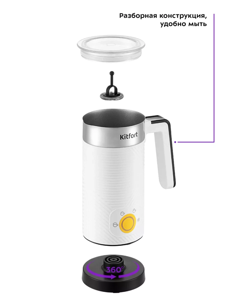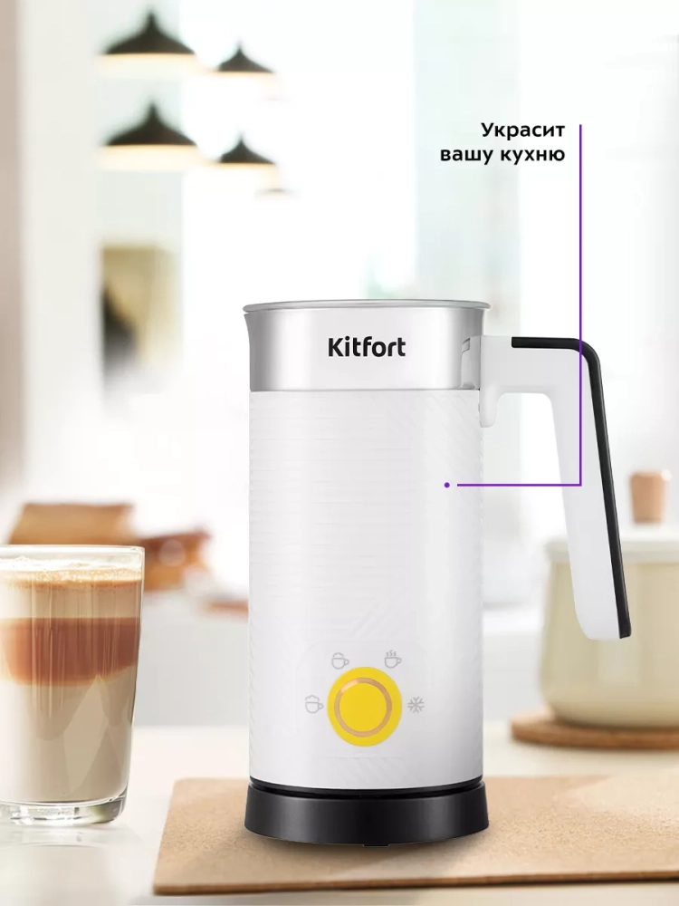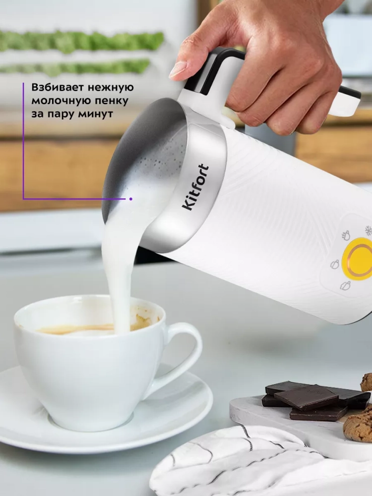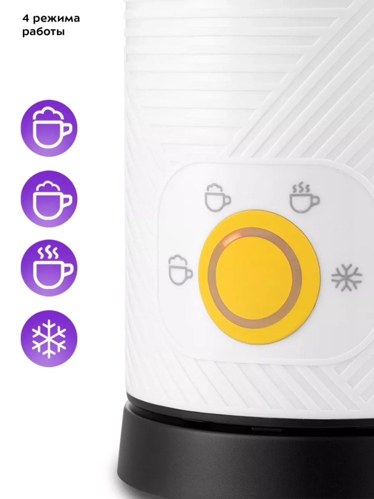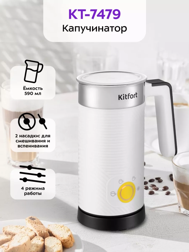 Капучинатор Kitfort КТ-7479 — это устройство для приготовления молочной пенки, используемой для напитков на базе эспрессо: капучино, латте и латте макиато. Прибор работает в 4 режимах: плотная и воздушная молочная пенка с нагревом, смешивание с нагревом и вспенивание без нагрева.