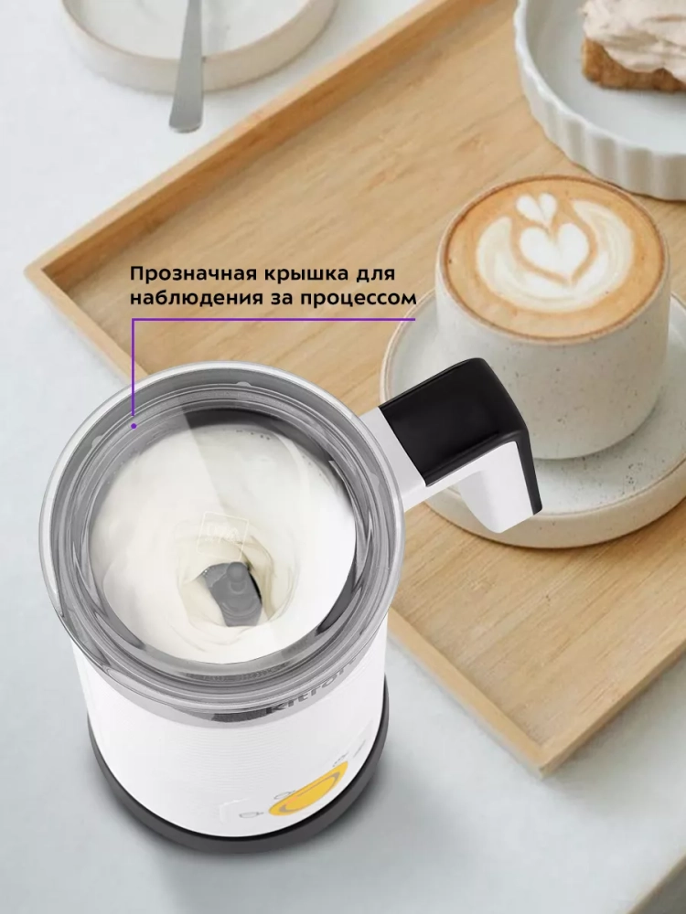 Капучинатор автоматически отключается, когда процесс взбивания или смешивания выполнен. Также вы можете остановить процесс приготовления вручную. Управление осуществляется с помощью двух кнопок на корпусе. Через прозрачную крышку можно наблюдать за приготовлением.