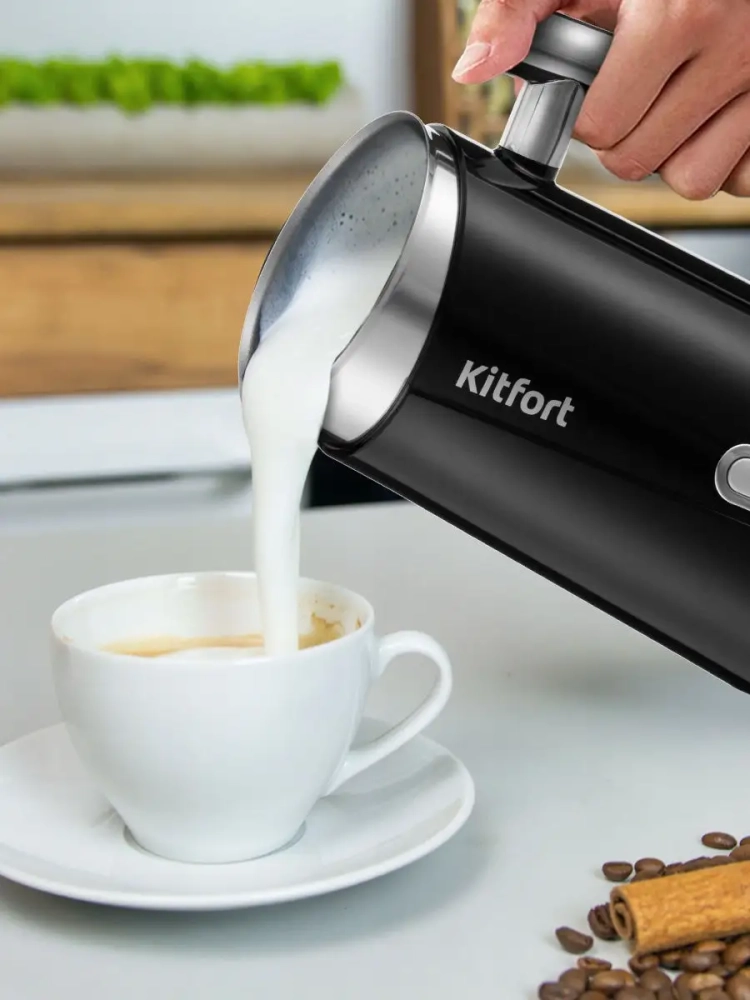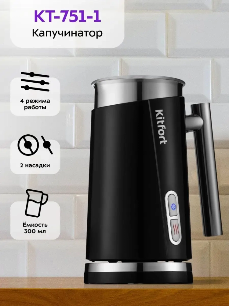 Капучинатор Kitfort КТ-751 — это устройство для приготовления молочной пенки, используемой для напитков на базе эспрессо: капучино, латте и латте макиато. Прибор работает в четырех режимах: горячее и холодное взбивание, смешивание с подогревом и без.