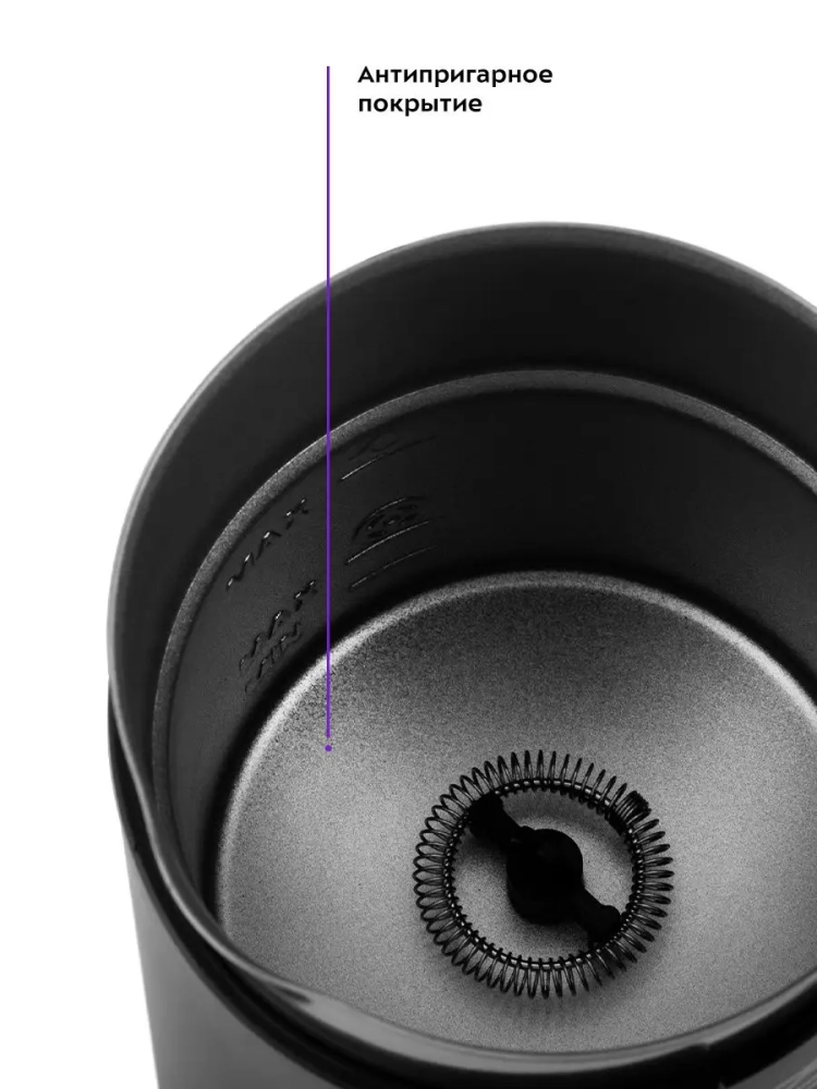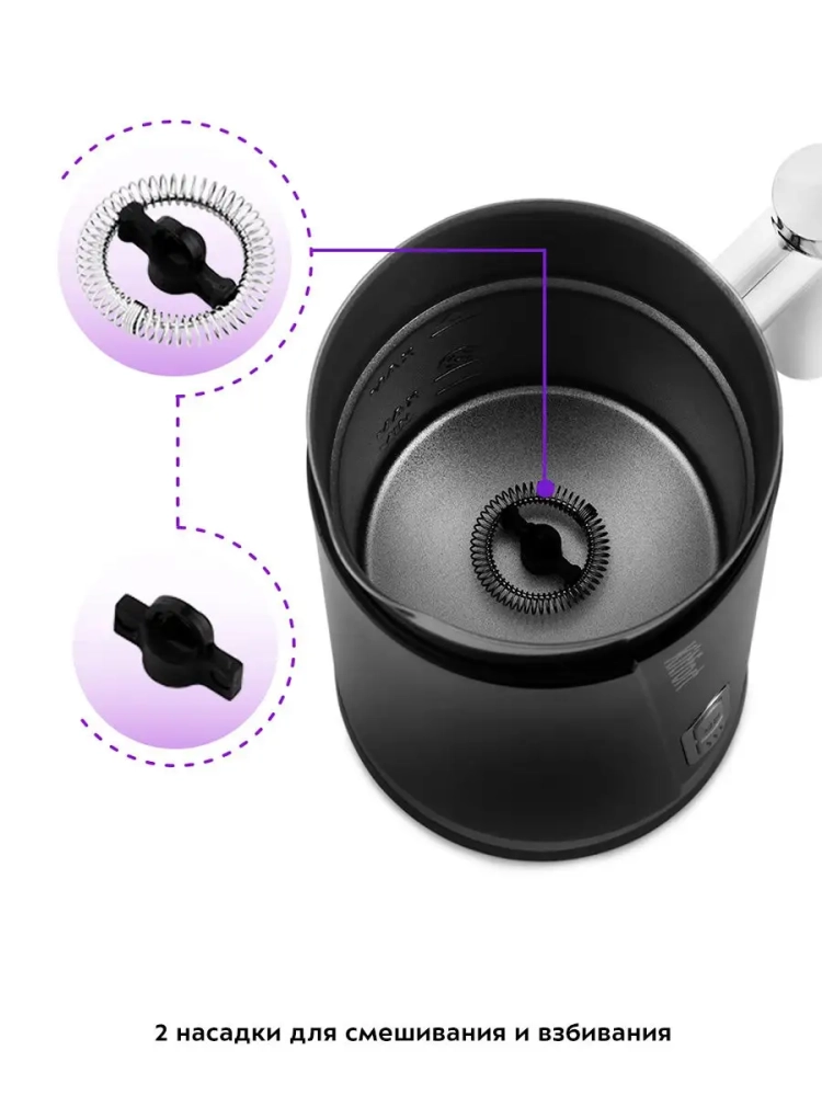 Капучинатор автоматически отключается, когда процесс взбивания или смешивания выполнен. В комплекте 2 насадки: для взбивания и перемешивания. Через прозрачную крышку можно наблюдать за приготовлением.