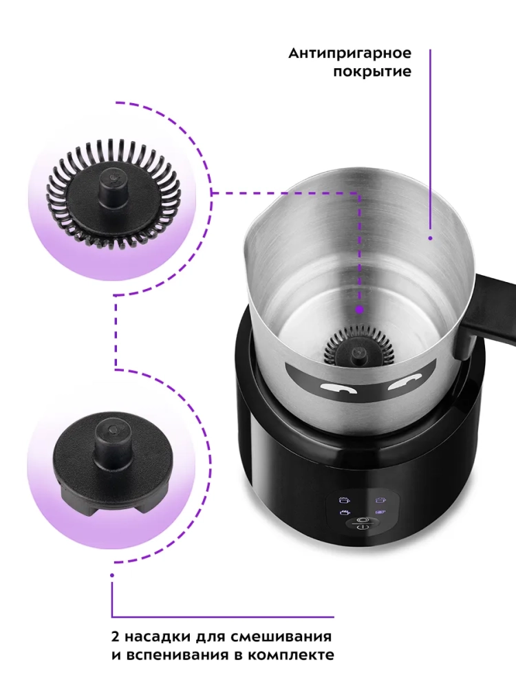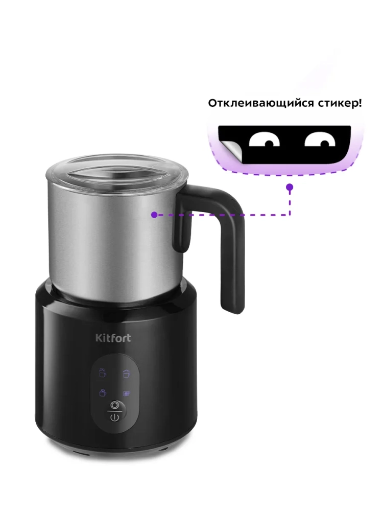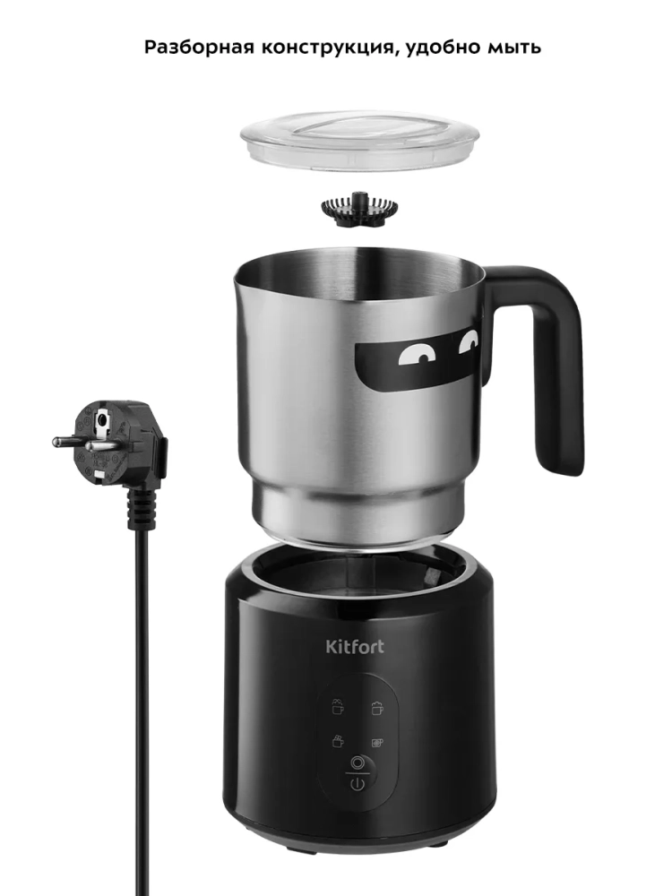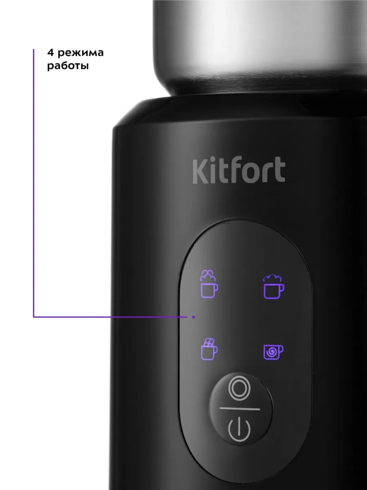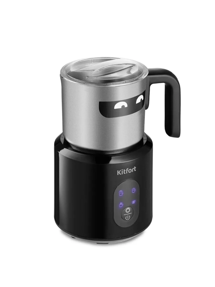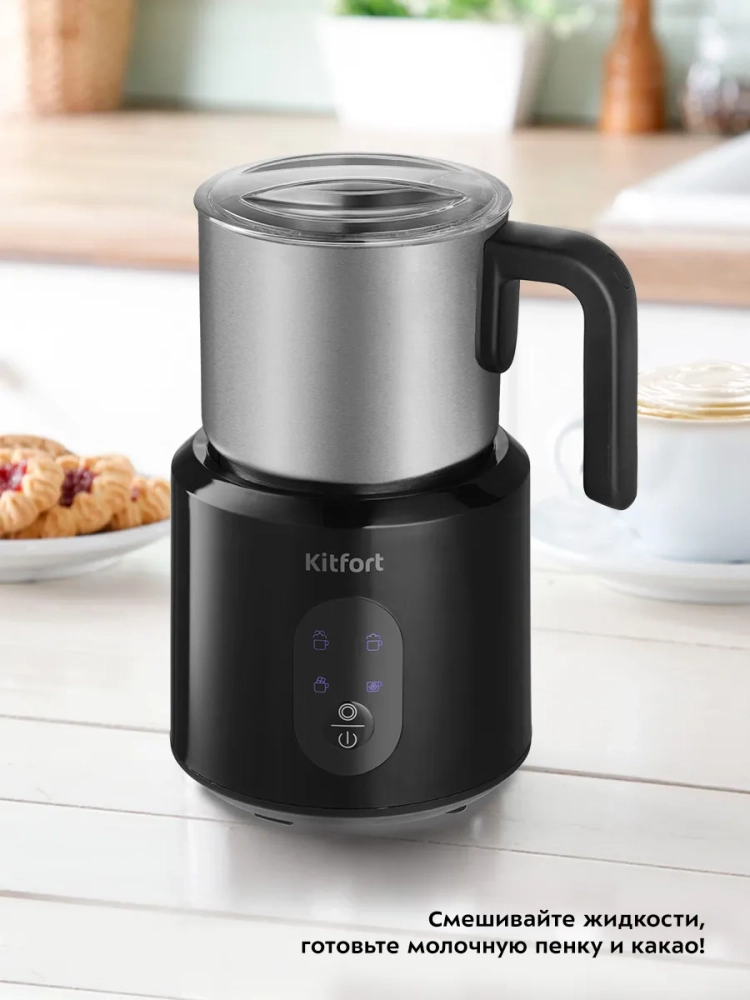 Капучинатор Kitfort КТ-793 — это устройство для приготовления молочной пенки, используемой для напитков на базе эспрессо: капучино, латте и латте макиато. Прибор работает в четырех режимах: вспенивание до густой пенки с подогревом, вспенивание до легкой пенки с подогревом, вспенивание без подогрева и смешивание с подогревом. Капучинатор автоматически отключается, когда процесс вспенивания или смешивания выполнен. В комплекте 2 насадки: для вспенивания и смешивания. Через прозрачную крышку можно наблюдать за приготовлением. Вращение насадки в капучинаторе производится по принципу магнитной мешалки. В моторном блоке под платформой электромотором вращается магнит, который создает вращающееся магнитное поле. Это поле действует на магниты, установленные внутри насадки, в результате она начинает вращаться. Таким образом, вращающий момент передается насадке не механически, а бесконтактно через магнитное поле. Благодаря этому чаша не имеет сквозной оси, поэтому можно не бояться протечки жидкости через нее, подшипник мешалки не нужно смазывать, а при застревании насадки мотор не застопорится и не сгорит. Капучинатор — идеальный выбор для тех, кому не хочется осваивать процесс самостоятельного вспенивания молока, следить за температурой, добиваться плотной однородной пены. Достаточно наполнить капучинатор нужным количеством молока и нажать нужную кнопку. Через несколько минут холодная или горячая молочная пена готова. Так же в капучинаторе можно готовить какао и смешивать жидкости.