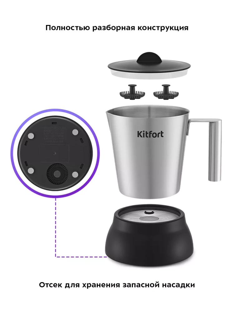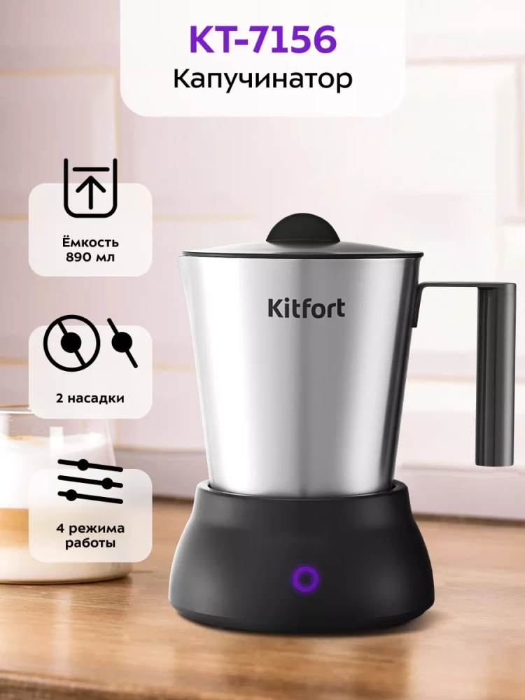 Капучинатор Kitfort КТ-7156 — это устройство для приготовления молочной пенки, используемой для напитков на базе эспрессо: капучино, латте и латте макиато. Прибор работает в 4 режимах: кофе по-турецки, молочная пенка с подогревом, горячее молоко и какао.