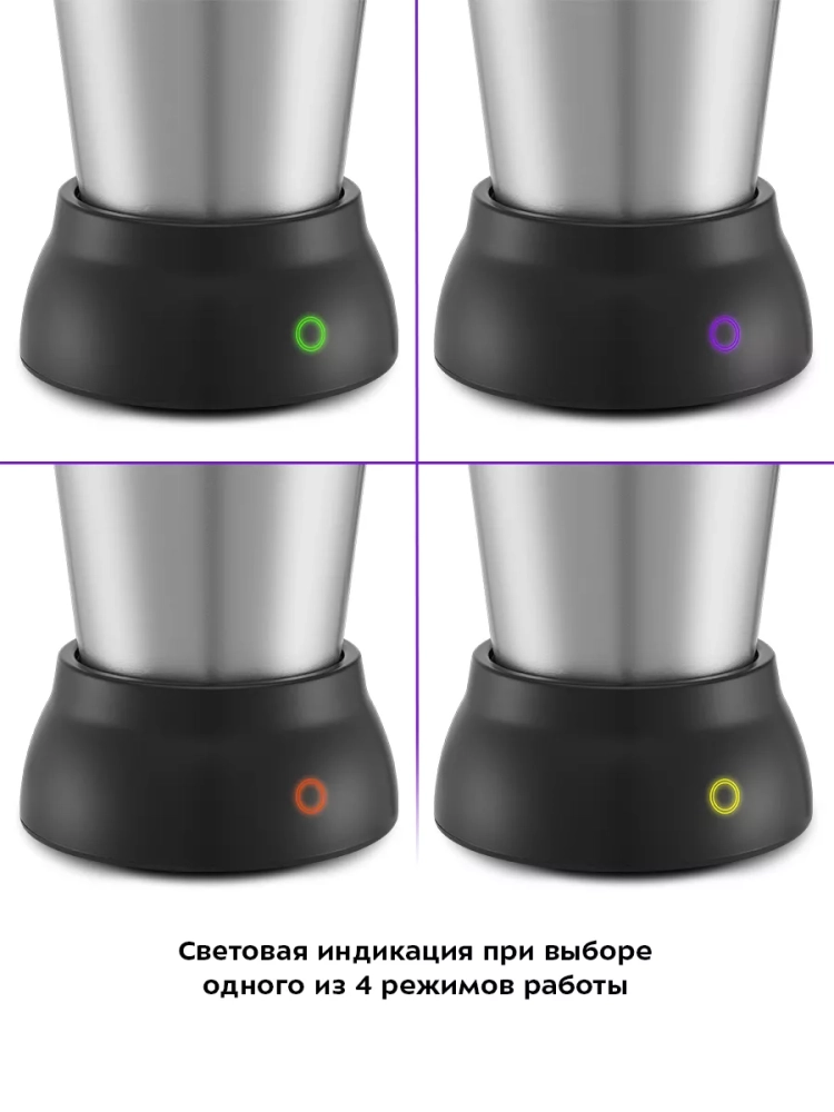 Капучинатор автоматически отключается, когда процесс взбивания или смешивания выполнен. Также вы можете остановить процесс приготовления вручную. Управление осуществляется с помощью 1 кнопки на моторном блоке. Через прозрачную крышку можно наблюдать за процессом приготовления.
