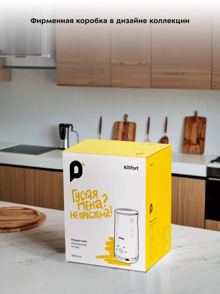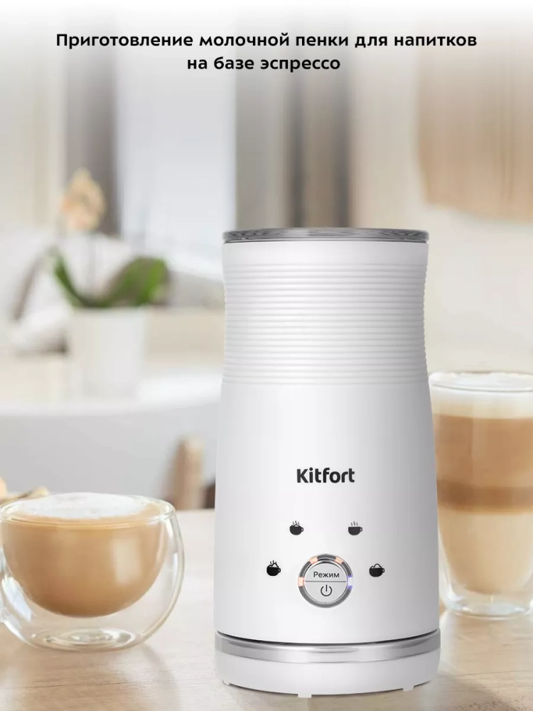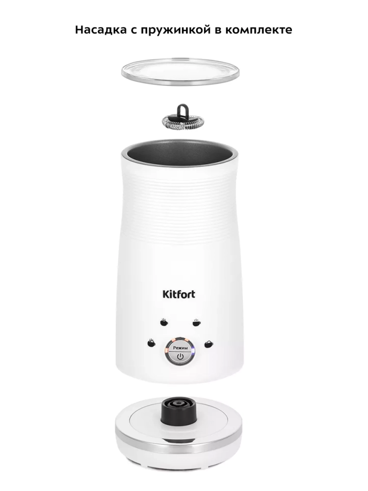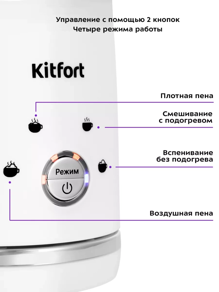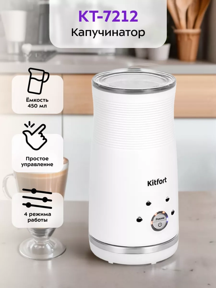 Капучинатор Kitfort КТ-7212 — это устройство для приготовления молочной пенки, используемой для напитков на базе эспрессо: капучино, латте и латте макиато. Прибор работает в четырех режимах: приготовление густой пенки с подогревом, приготовление воздушной пенки с подогревом, смешивание с подогревом и вспенивание без подогрева.