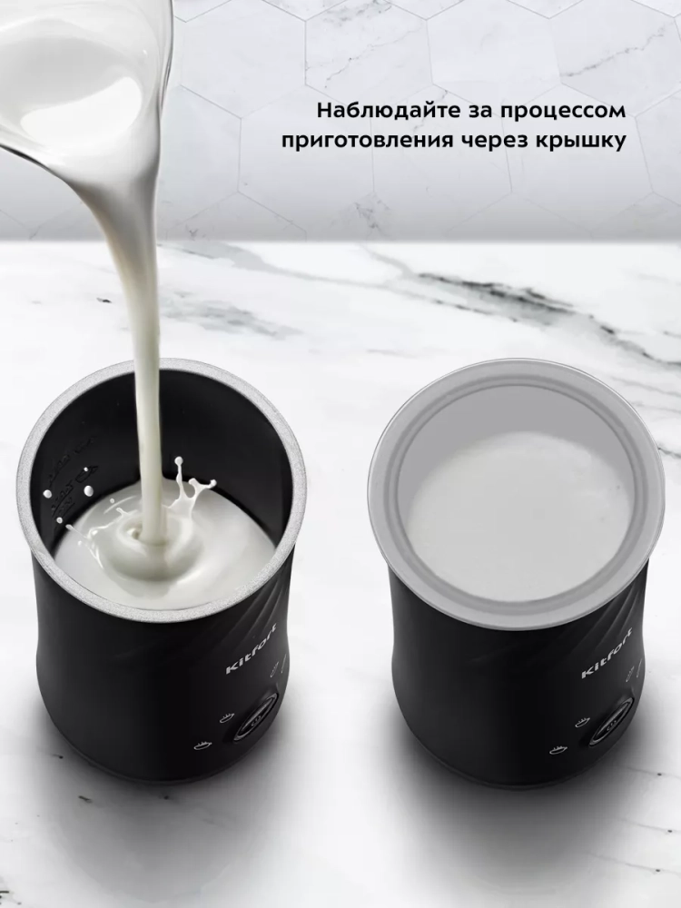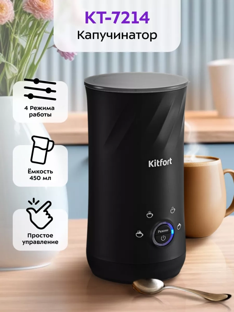 Капучинатор Kitfort КТ-7214 — это устройство для приготовления молочной пенки, используемой для напитков на базе эспрессо: капучино, латте и латте макиато. Прибор работает в четырех режимах: приготовление густой пенки с подогревом, приготовление воздушной пенки с подогревом, смешивание с подогревом и вспенивание без подогрева.