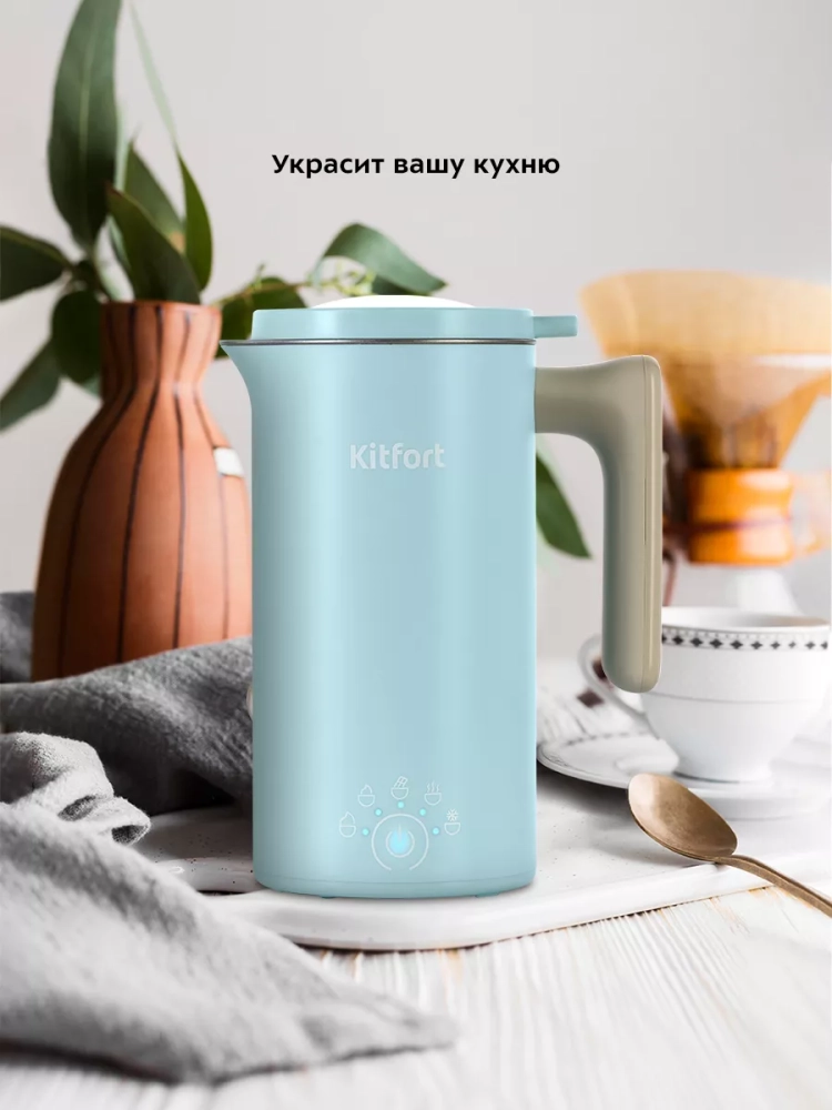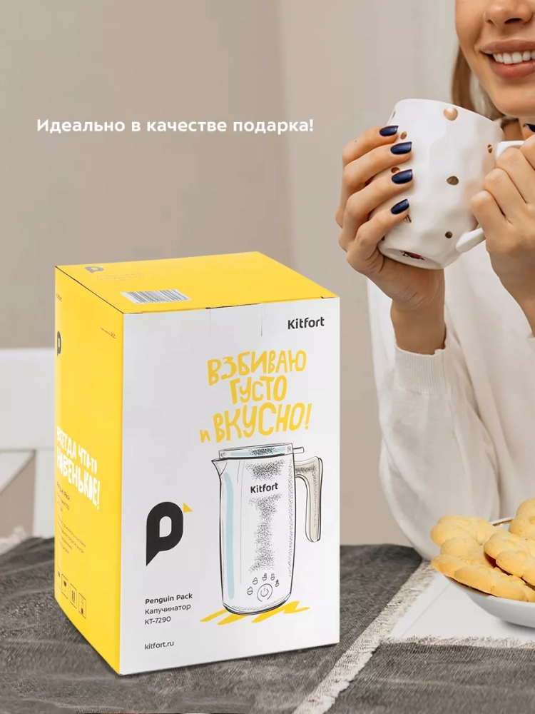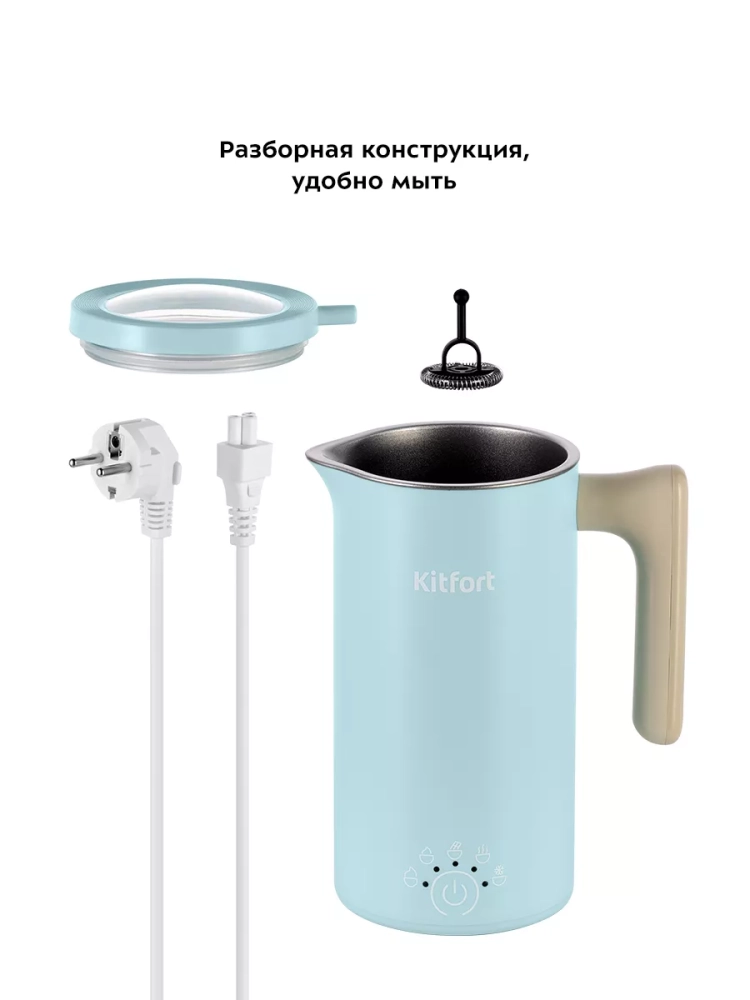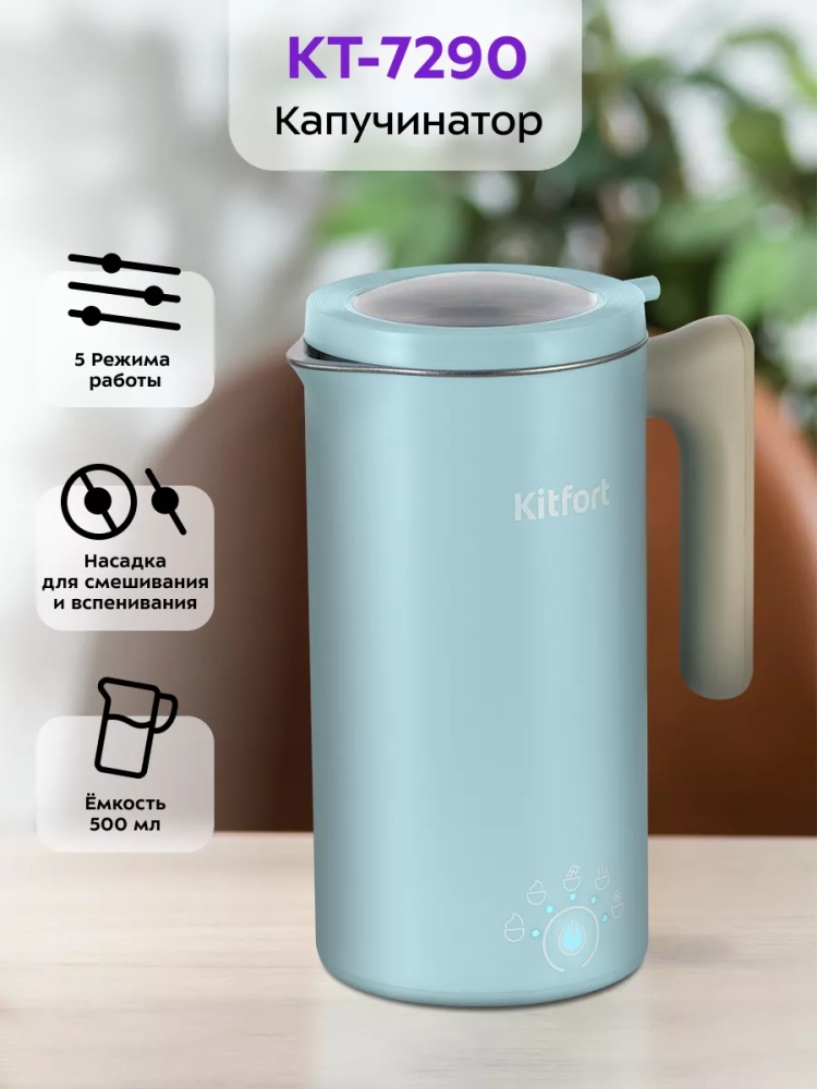 Капучинатор Kitfort КТ-7290 — это устройство для приготовления молочной пенки, используемой для напитков на базе эспрессо: капучино, латте и латте макиато. Прибор работает в пяти режимах: плотная и воздушная молочная пенка с нагревом, приготовление какао, смешивание с нагревом и вспенивание без нагрева.