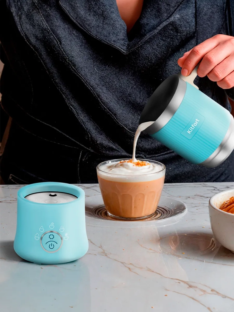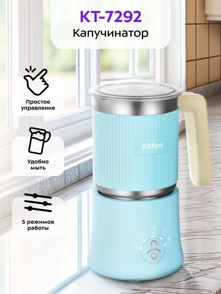Капучинатор Kitfort КТ-7292 — это устройство для приготовления молочной пенки, используемой для напитков на базе эспрессо: капучино, латте и латте макиато. Прибор работает в 5 режимах: плотная и воздушная молочная пенка с нагревом, приготовление какао, смешивание с нагревом и вспенивание без нагрева.