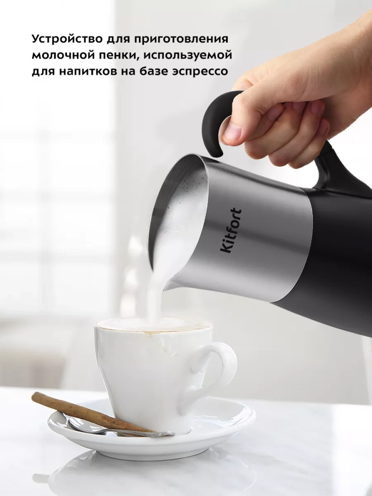 Капучинатор Kitfort КТ-7157 — это устройство для приготовления молочной пенки, используемой для напитков на базе эспрессо: капучино, латте и латте макиато. Прибор работает в трех режимах: кофе по-турецки, молочная пенка с нагревом и какао. Благодаря наличию насадки для смешивания, вы также можете подогреть молоко в капучинаторе.