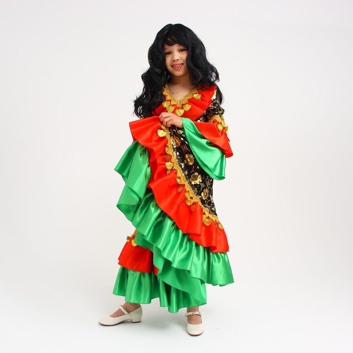 Карнавальный костюм «Цыганка» — это яркий и красочный наряд для девочек, идеально подходящий для карнавальных праздников и представлений. Костюм состоит из платья с воланами в красно-зелёной гамме, изготовленного из 100% полиэстера, что делает его лёгким и удобным для ношения.