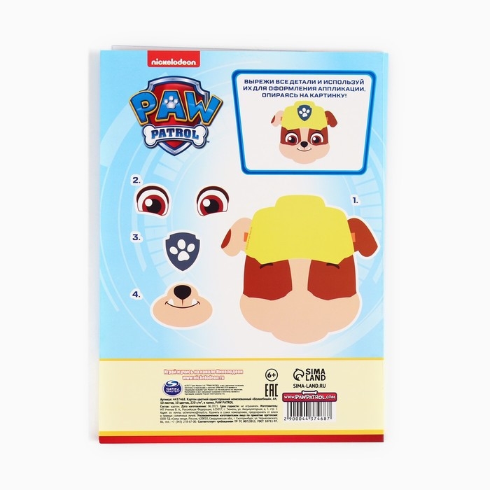 Картон цветной, А4, 10 листов, 10 цветов, немелованный, односторонний, в папке, 220 г/м², Щенячий патруль