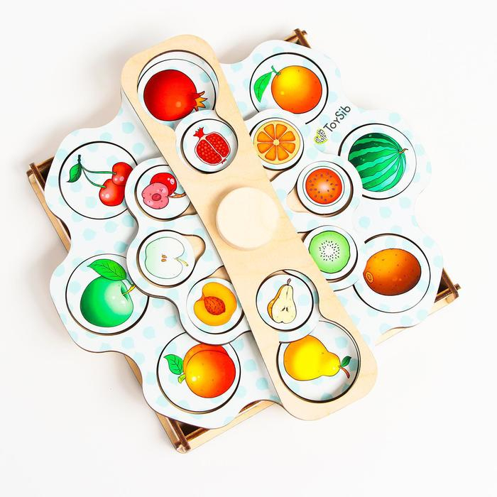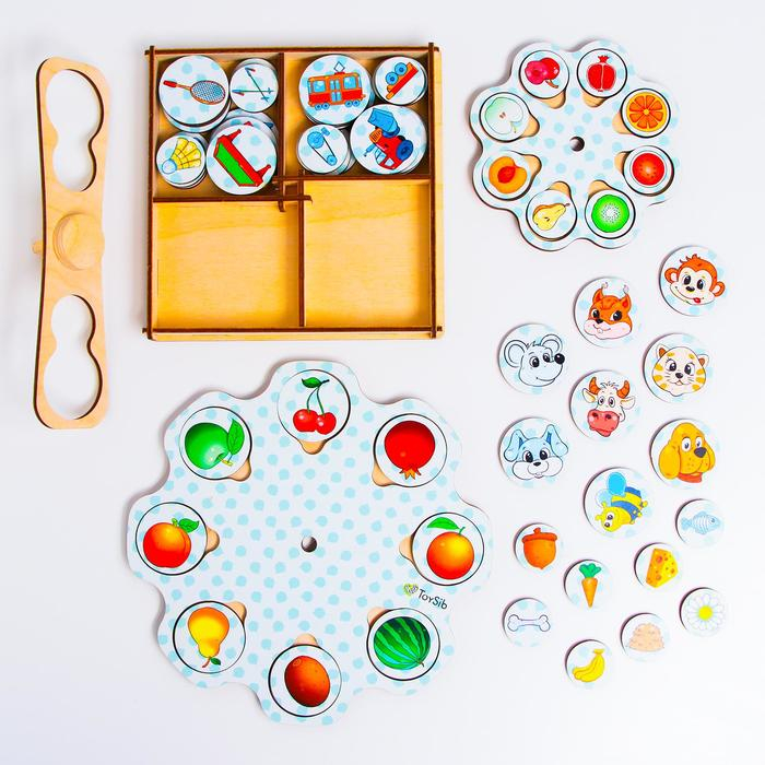 - Вложите в большое игровое колесо большие фишки одной тематики. Например фишки с мордочками животных, а в маленькое игровое колесо фишки с угощениями для животных в произвольном порядке.