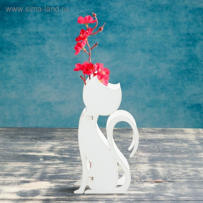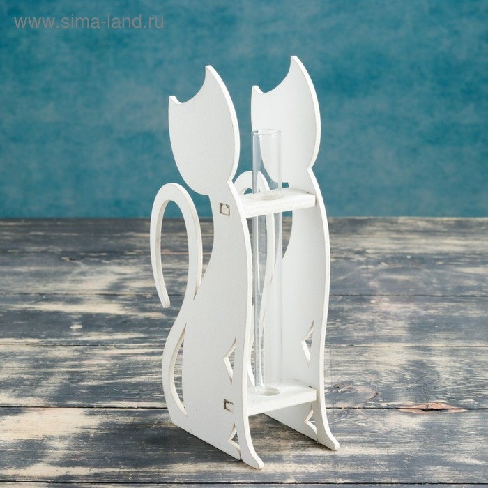 Кашпо деревянное 13×5.2×24.5 см с 1 колбой "Кошка", белый Дарим Красиво