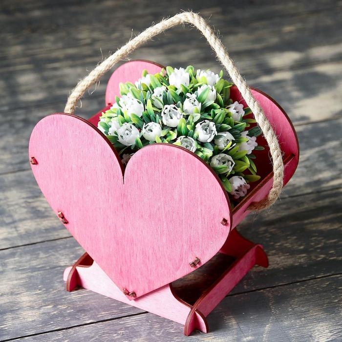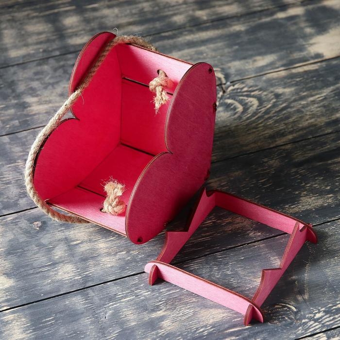 Кашпо деревянное 17.7×10.5×15 см уникальное "Сердце на двоих", ручка верёвка, бордовый