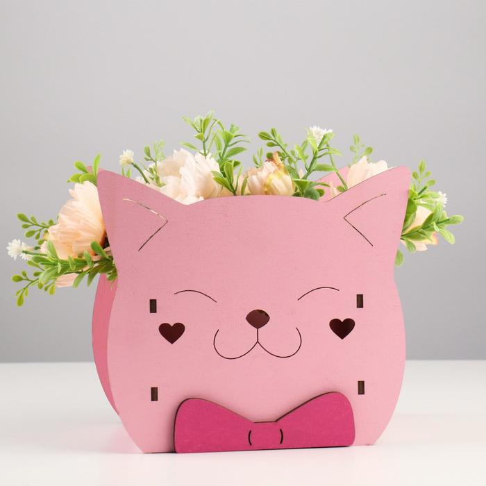 Кашпо деревянное для цветов и подарков "Котик" с аппликацией, розовое, 19х12х16 см