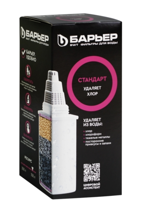 Кассета сменная БАРЬЕР Стандарт, удаление хлора Материал Пластик, полипропилен, фильтрующие элементы Цвет (NF) Белый Размер/Формат 6,4х6,4х14,6см Вид упаковки Картонная упаковка. Кассета сменная БАРЬЕР Стандарт эффективно нейтрализует хлор и хлорорганические соединения, а также очистит воду от других вредных примесей. Кокосовый активированный уголь, обработанный серебром, предотвращает рост бактерий, а ионообменное волокно удаляет тяжелые металлы и растворенное железо. Сменный блок имеет рабочий ресурс до 350л.