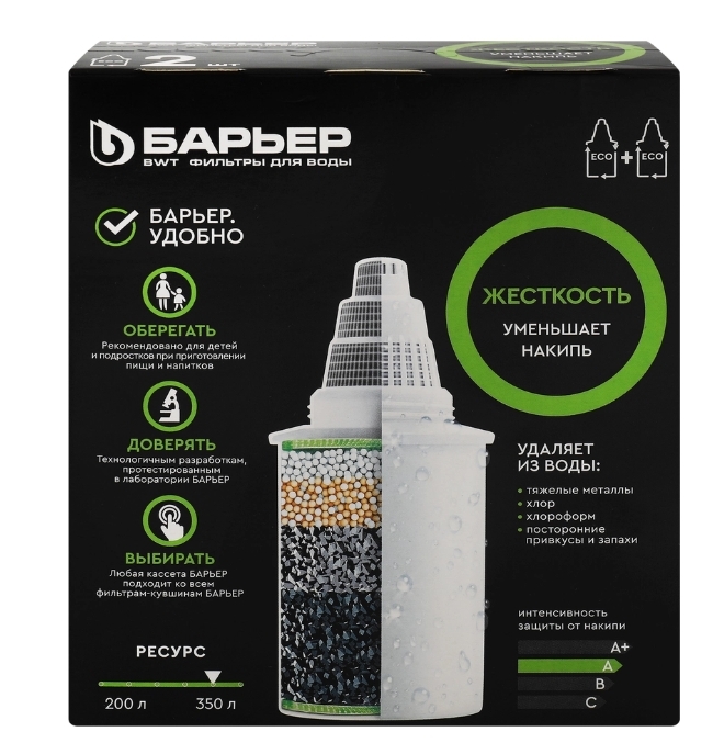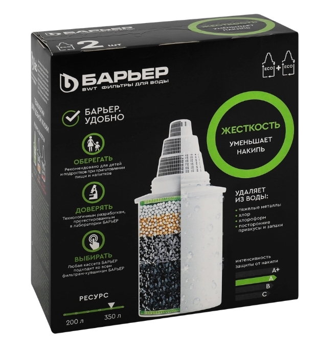 Кассета сменная БАРЬЕР Жесткость, защита от накипи Арт. К272Р00, 2шт Материал Пластик, полипропилен, фильтрующие элементы Цвет (NF) Белый Количество штук в упаковке 2 Размер/Формат 6,4х6,4х14,6см Вид упаковки Картонная упаковка Страна Россия. Кассета сменная БАРЬЕР Жесткость смягчает воду, таким образом защищая бытовую технику от образования накипи и появления известкового налета. Высокая эффективность сменного блока обусловлена сочетанием технологий: смесь ионообменных смол снижает общую жесткость и нейтрализует тяжелые металлы, а технология NanoPlus увеличивает ресурс компонентов кассеты. Модуль имеет рабочий ресурс до 350л. Картридж можно сдать на утилизацию с последующей переработкой пластика