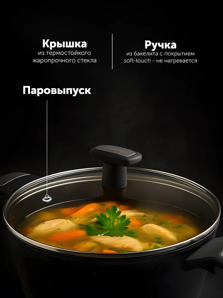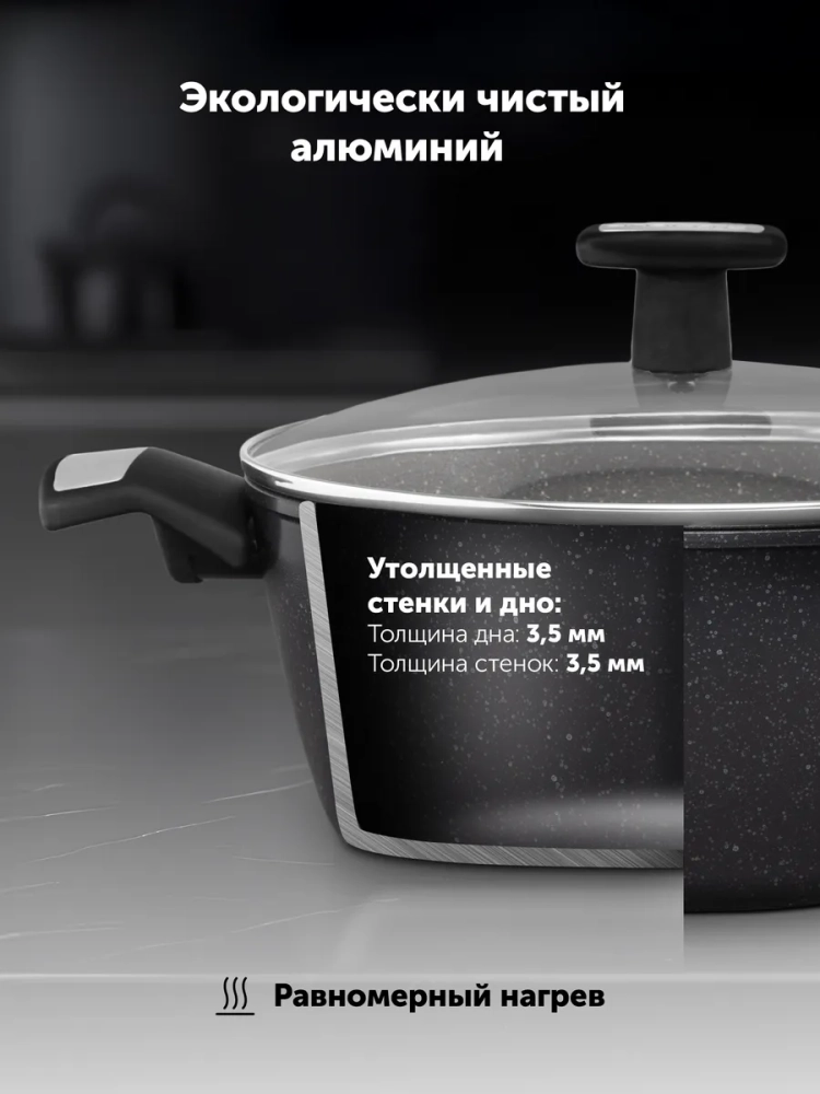 Кастрюля коллекции Monolit 20C с крышкой - это приготовление вкусных блюд, сопровождение прекрасного настроения, создание вашей кулинарной жизни. гарантия - 2 года. ПОДХОДИТ ДЛЯ ВСЕХ ПЛИТ, ВКЛЮЧАЯ ИНДУКЦИОННЫЕ! Комплектуется стеклянной крышкой из жаропрочного стекла, которая плотно прилегает к краям посуды, имеет отверстие для выпуска пара и металлический обод, который позволяет не пролить жидкость и сохранить аромат. Наша кастрюля имеет термостойкую эргономичную бакелитовую ручку с покрытием «Soft Touch», удобна для захвата и остается прохладной во время приготовления пищи, без этого было бы невозможно контролировать процесс приготовления вкусных блюд. С Polaris можно воплотить в жизнь все кулинарные рецепты, так как в такой посуде можно готовить пищу любым способом: варить, жарить, тушить, также можно приготовить: суп, жаркое, варенье, заготовки, кашу, крупы. Безопасна для здоровья человека и не выделяет вредных веществ при контакте с пищей и использовании при высоких температурах, поэтому подходит для приготовления еды детям. Комплект кастрюль можно мыть как вручную, так и в посудомоечной машине. Корпус из кованого алюминия равномернее прогревается и дольше сохраняет тепло, чем посуда из штампованного алюминия. Обеспечивает быстрый нагрев и равномерное распределение тепла, и предотвращает появление точек на поверхности от перегрева. 5-слойное инновационное антипригарное покрытие с керамической крошкой не содержит вредные для здоровья вещества PFOA и PFOS.Антипригарное покрытие DYFLON очень легко чистить - можно мыть в посудомоечной машине. Благодаря превосходным антипригарным свойствам нашей посуды и внутренней поверхности без заклепок, уход за изделием становится легкой задачей. Просто протрите тряпкой или промойте водой. Микросотовая структура поверхности равномерно распределяет масло и удерживает его на месте.