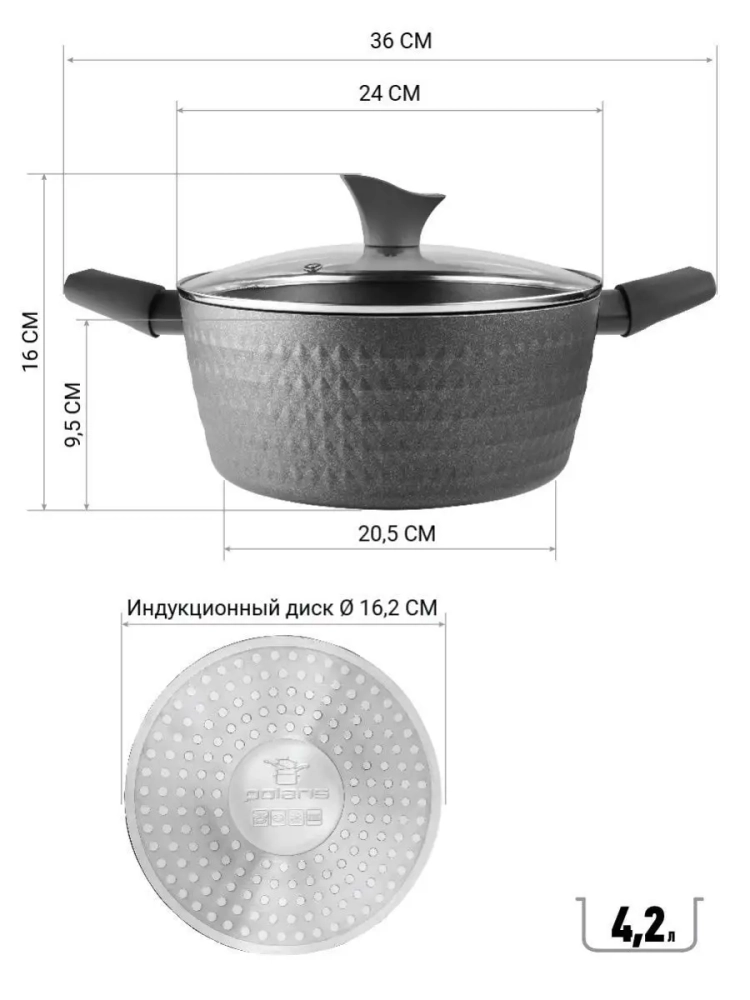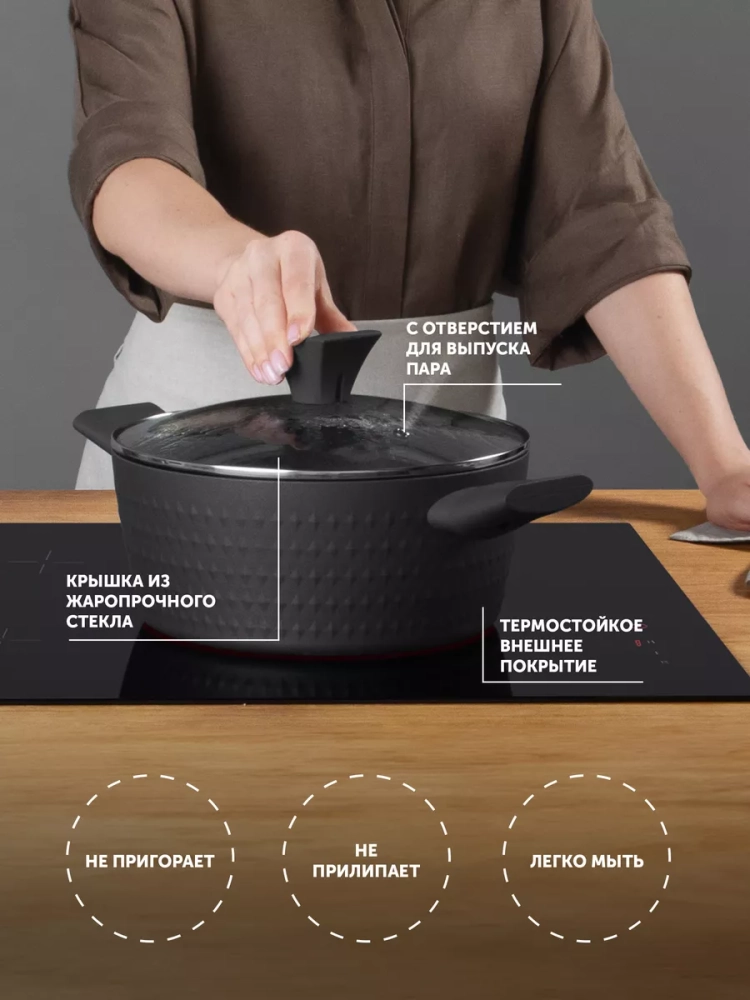 Стеклянная прозрачная крышка диаметром 24 см выполнена из жаропрочного стекла и имеет отверстие для выпуска пара. Термостойкие бакелитовые ручки с покрытием «Soft Touch» не нагреваются во время приготовления пищи, в отличие от ручек из пластика и стали. Кастрюля Поларис - это универсальный помощник каждой хозяйки! Благодаря тому, что модель Kontur 24C глубокая и большая (объем 4,2 литра), она идеально подходит для разных задач: варки, тушения, приготовления соусов и супов. Кастрюля Polaris для индукции – это сочетание стиля и практичности. Необычный дизайн и красивые элементы сделают кастрюлю отличным подарком для дома, особенно для мамы на День Рождения или 8 марта.