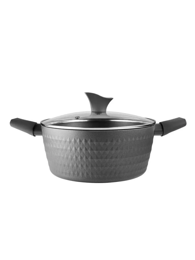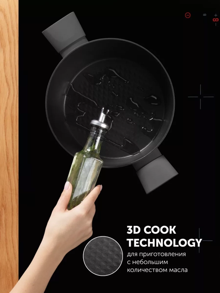 Корпус изделия выполнен из кованого алюминия, что обеспечивает равномерное распределение температуры во время приготовления пищи и максимально долгое сохранение тепла готовых блюд, в отличие от эмалированной посуды и посуды из нержавеющей стали. Внутренняя рифлёная поверхность 3D COOK TECHNOLOGY позволяет приготовить любимые блюда с минимальным количеством масла и жира, сохраняя натуральный вкус продуктов.