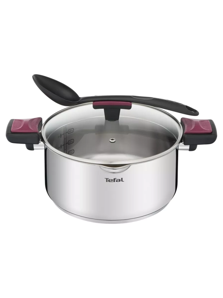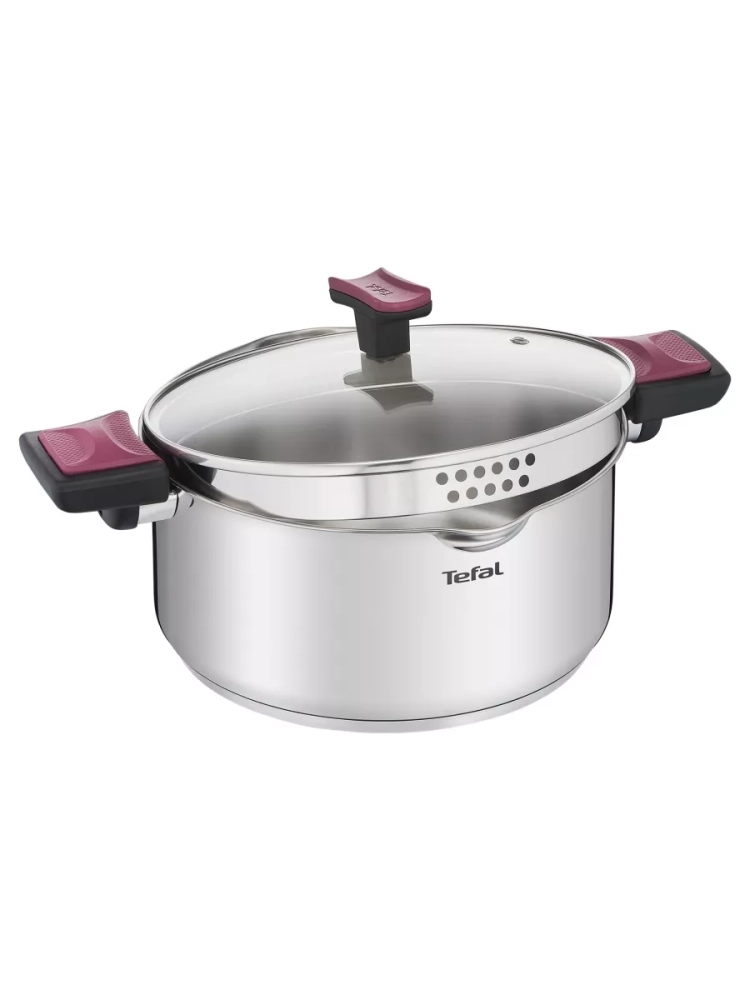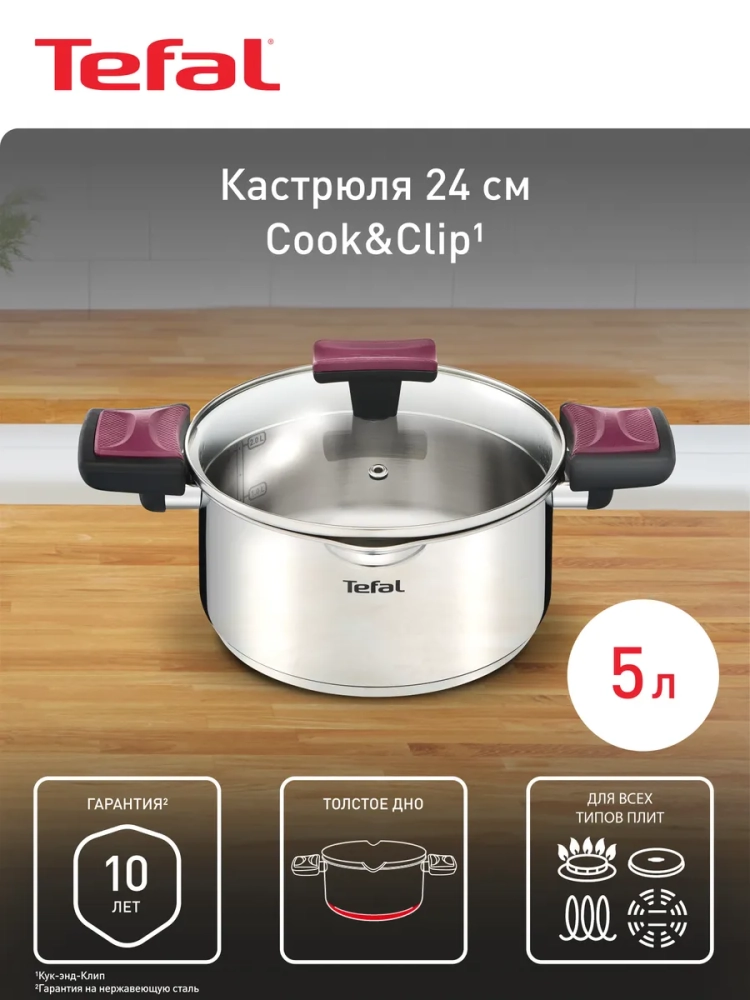 Кроме того, кастрюля Тефаль со сливом из нержавеющей стали подходит для использования на газовых, электрических, стеклокерамических и индукционных плитах. Готовьте так, как вы любите, и будьте спокойны за свою посуду с 10-летней гарантией производителя на качественную нержавеющую сталь и усовершенствованные технологии производства, которые гарантируют максимальную прочность, устойчивость к повреждениям, долговечность и удовольствие от использования. Во время готовки закрывайте посуду крышкой, чтобы вода закипала быстрее, тем самым это поможет избежать перерасхода электроэнергии. Порадуйте себя и своих близких полной коллекцией из серии Cook & Clip: кастрюли с крышками (20 см, 22 см), ковш с крышкой 16 см, а также набор посуды из 6 предметов.