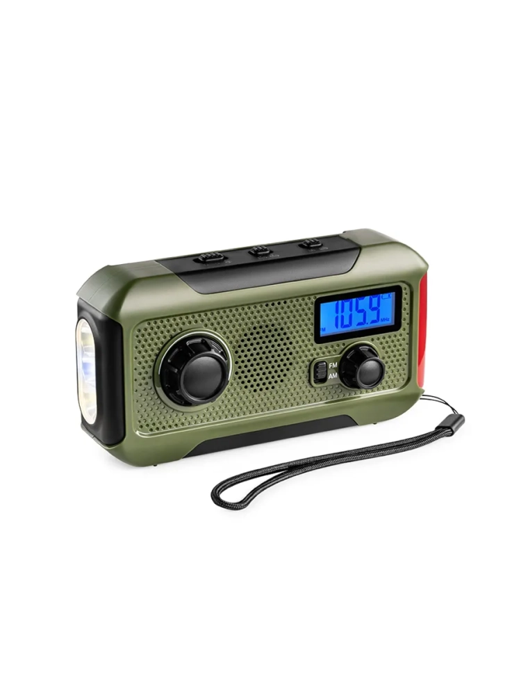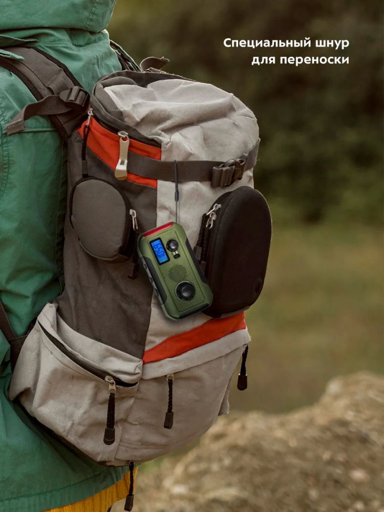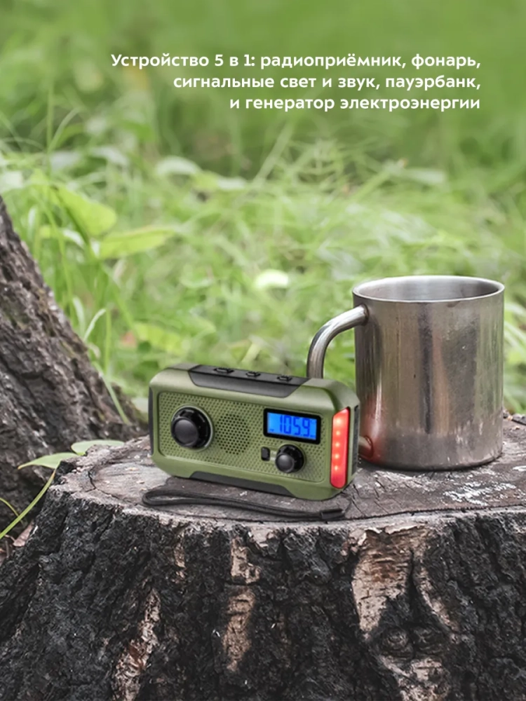 Кемпинговый фонарь 5 в 1 Kitfort KT-3341 - многофункциональное устройство для походов или путешествий, сочетающее в себе функции радиоприемника, фонаря, сигнальных света и звука, пауэрбанка и генератора электроэнергии. Генератор выполнен по принципу динамо-машины: на корпусе кемпингового фонаря есть ручка, при вращении которой генерируется электроэнергия. Кемпинг (в переводе с английского - Проживание в лагере) подразумевает вид туризма с проживанием в палатках. Устройство будет полезно также для рыбаков или любителей собирать в лесу грибы или ягоды. Кемпинговый фонарь питается от встроенного аккумулятора или четырех батареек типа ААА (в комплект не входят). Если встроенный аккумулятор сел, вы можете зарядить его, вращая ручку генератора. Однако, необходимо учитывать, что генератор небольшой, а вращение ручки требует некоторых усилий и времени, поэтому полностью и быстро зарядить встроенный аккумулятор или мобильное устройство не получится. Сигнальные свет и звук предназначены для использования в экстренных ситуациях, например, если вы потерялись в лесу. На верхней части устройства расположены антенна для радио и переключатели света, зарядки и источника питания. На передней части расположены индикатор уровня заряда, дисплей, регулятор громкости, переключатель FM/AM диапазона и переключатель частот. Ручка генератора расположена на обратной стороне и для удобства складывается в углубление на корпусе. Сбоку расположены порт USB, разъем Micro-USB и разъем mini-jack (3,5 мм), чтобы радио можно было слушать в наушниках. Разъемы закрыты заглушкой для защиты от пыли, грязи или влаги. Также в комплекте есть шнур для переноски.