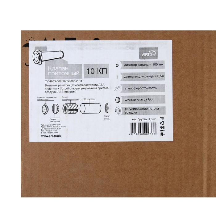 Клапан приточный ERA 10КП, d=100 мм, длина 500 мм, внешняя решетка из ABS-пластика